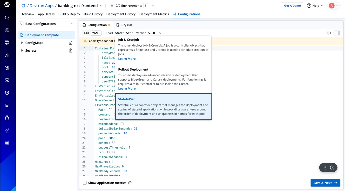 The StatefulSet chart in Devtron allows you to deploy and manage stateful applications. StatefulSet is a Kubernetes resource that provides guarantees about the ordering and uniqueness of Pods during deployment and scaling.