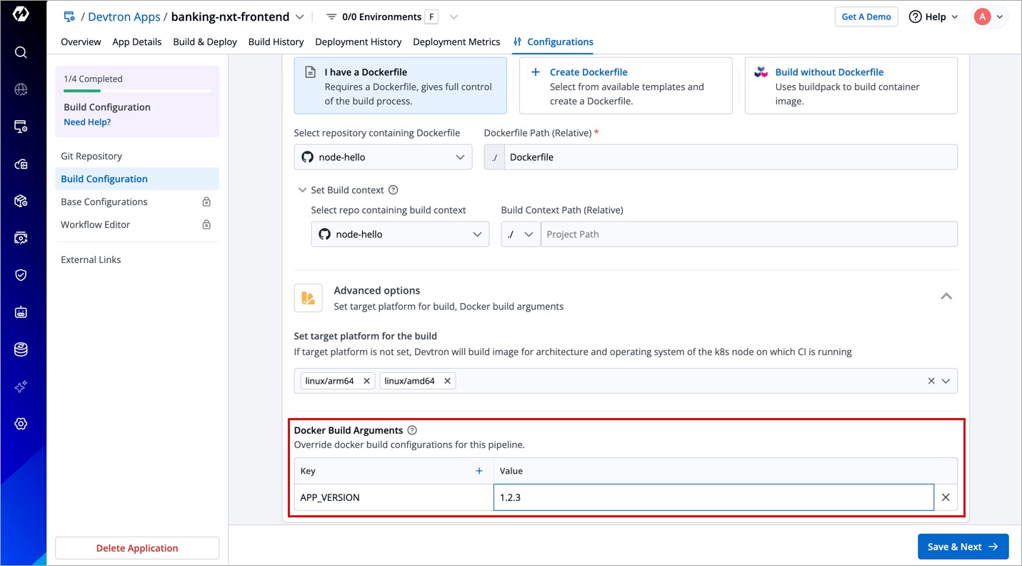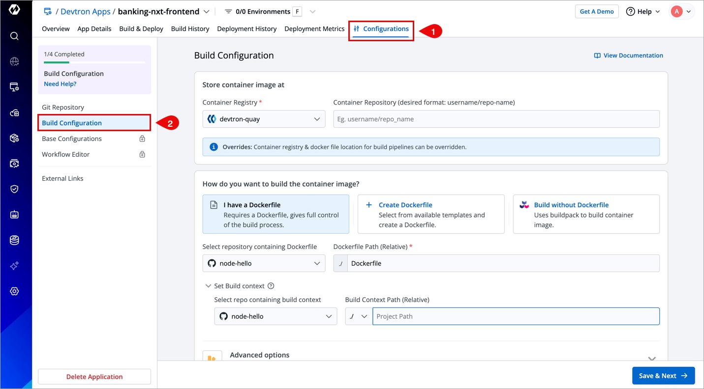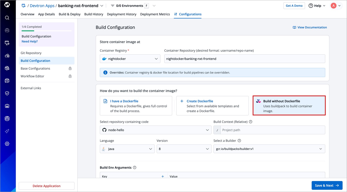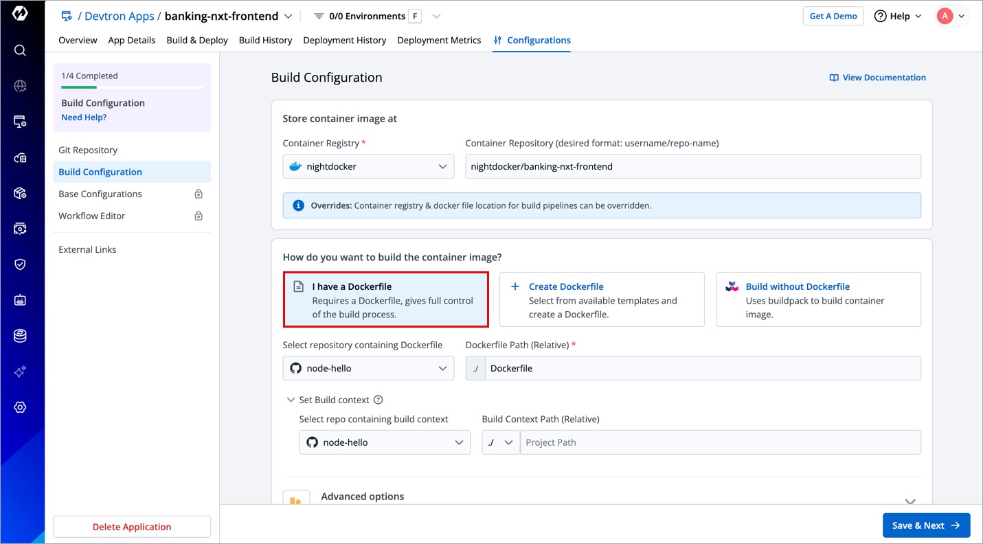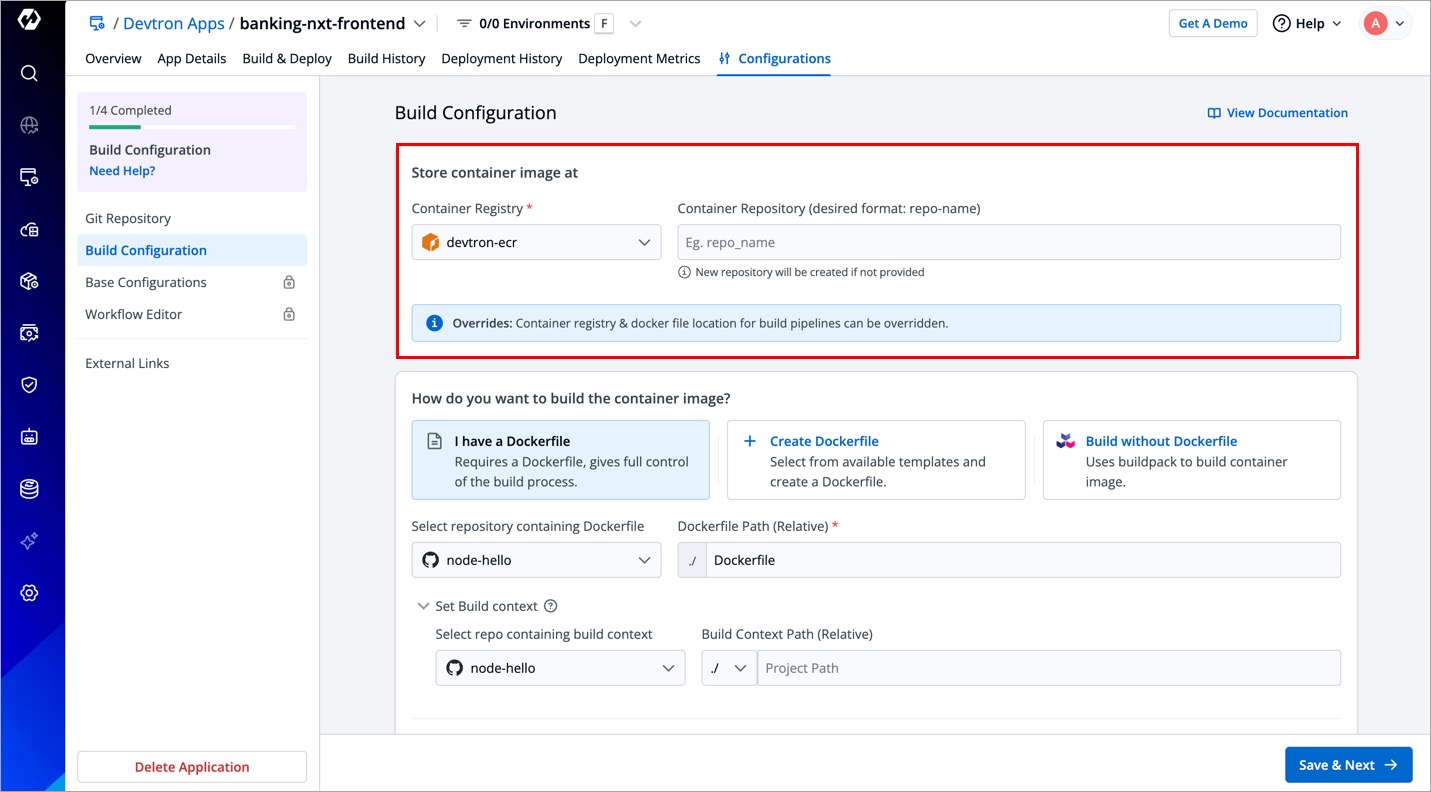 Build configuration is used to create and push docker images in the container registry of your application. You will provide all the docker related information to build and push docker images on the Build Configuration page.