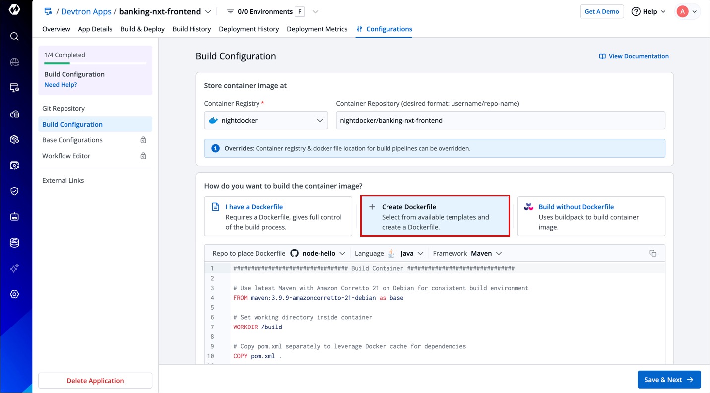With the option Create Dockerfile, you can create a Dockerfile from the available templates. You can edit any selected Dockerfile template as per your build configuration requirements.