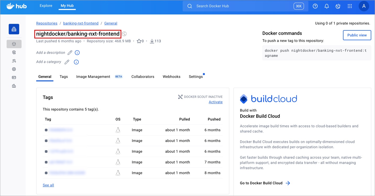 If you are using Docker Hub account, you need to enter the repository name along with your username. For example, if your username is nightdocker and repo name is banking-nxt-frontend, then enter