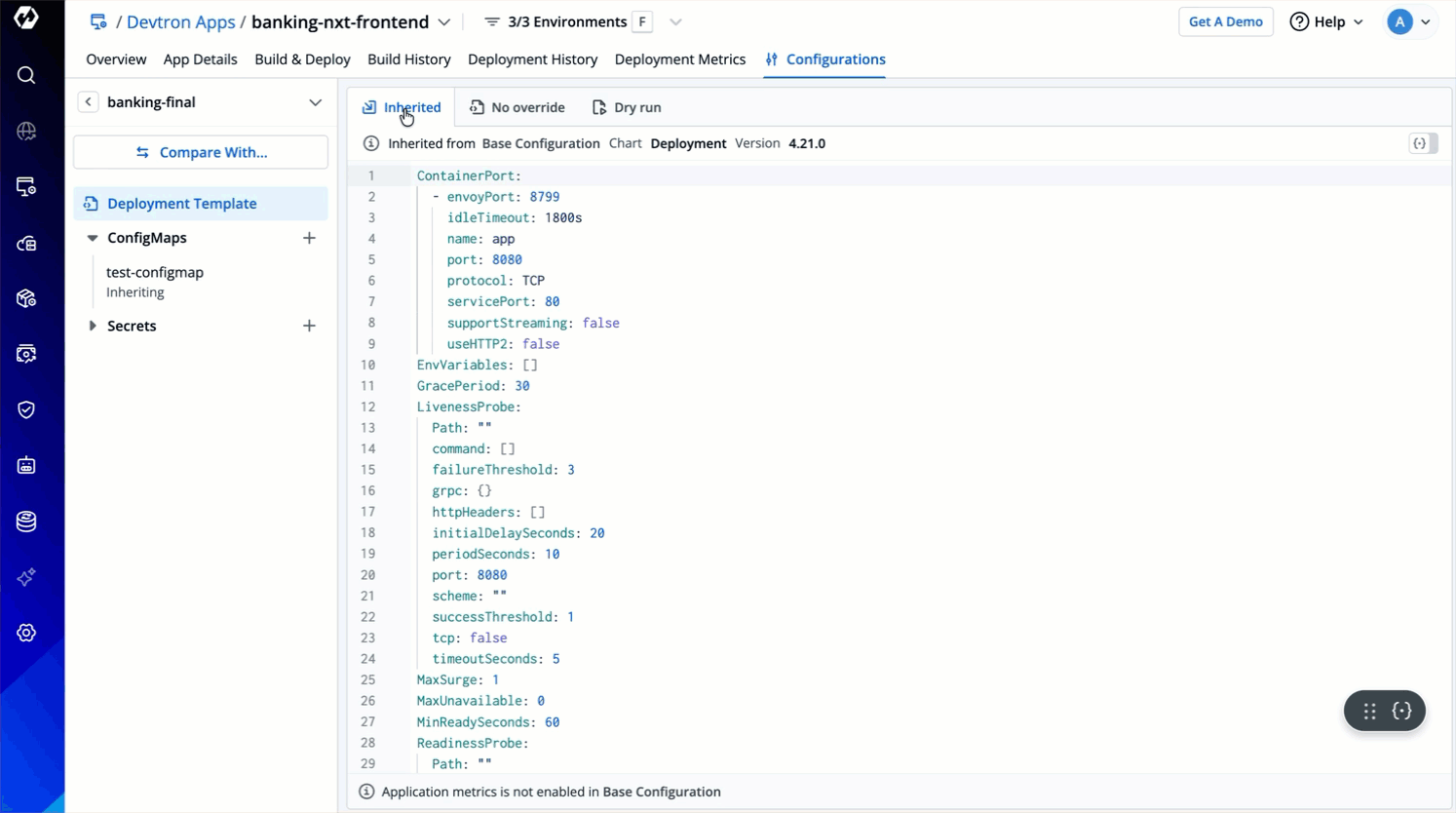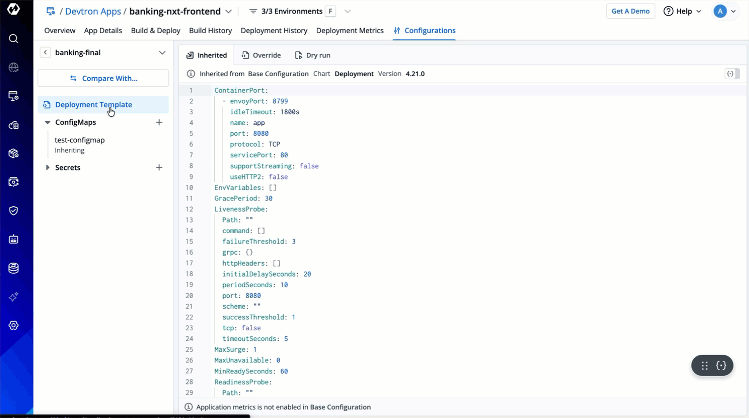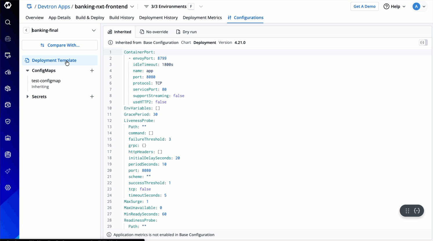 When you add a deployment pipeline to an application's workflow, each environment configuration initially inherits the Deployment Template, ConfigMap and Secret from the Base Configurations of the application.