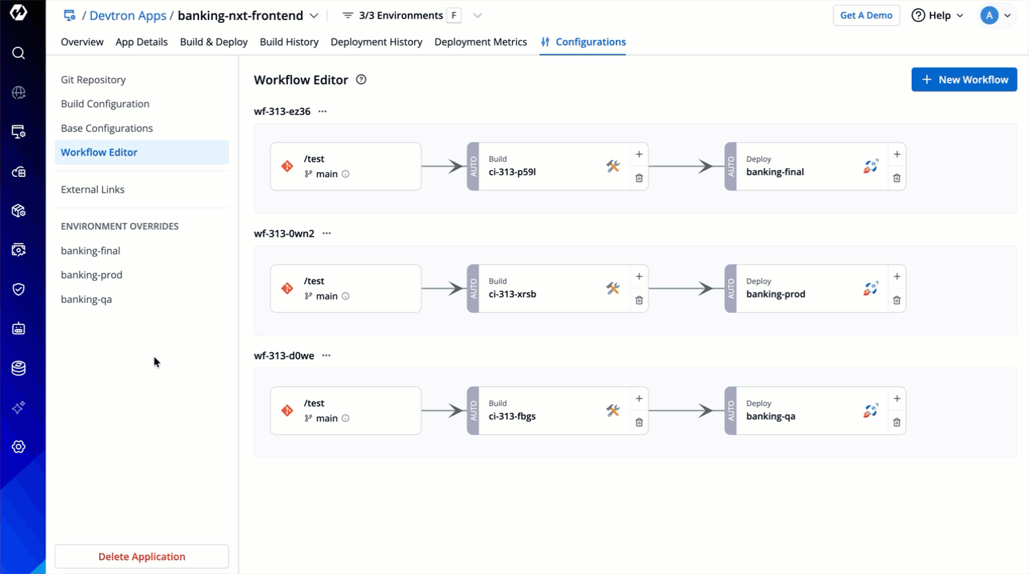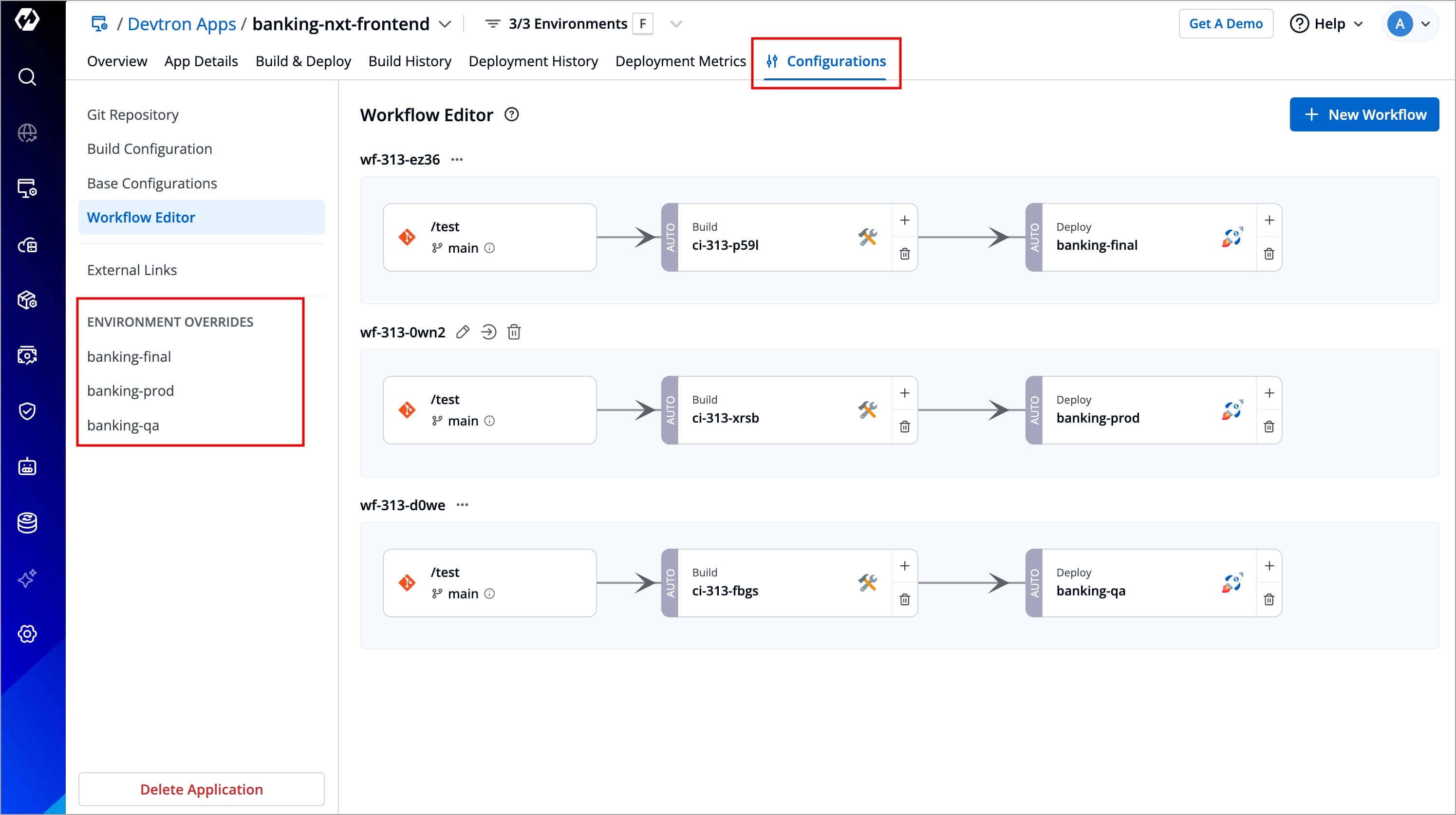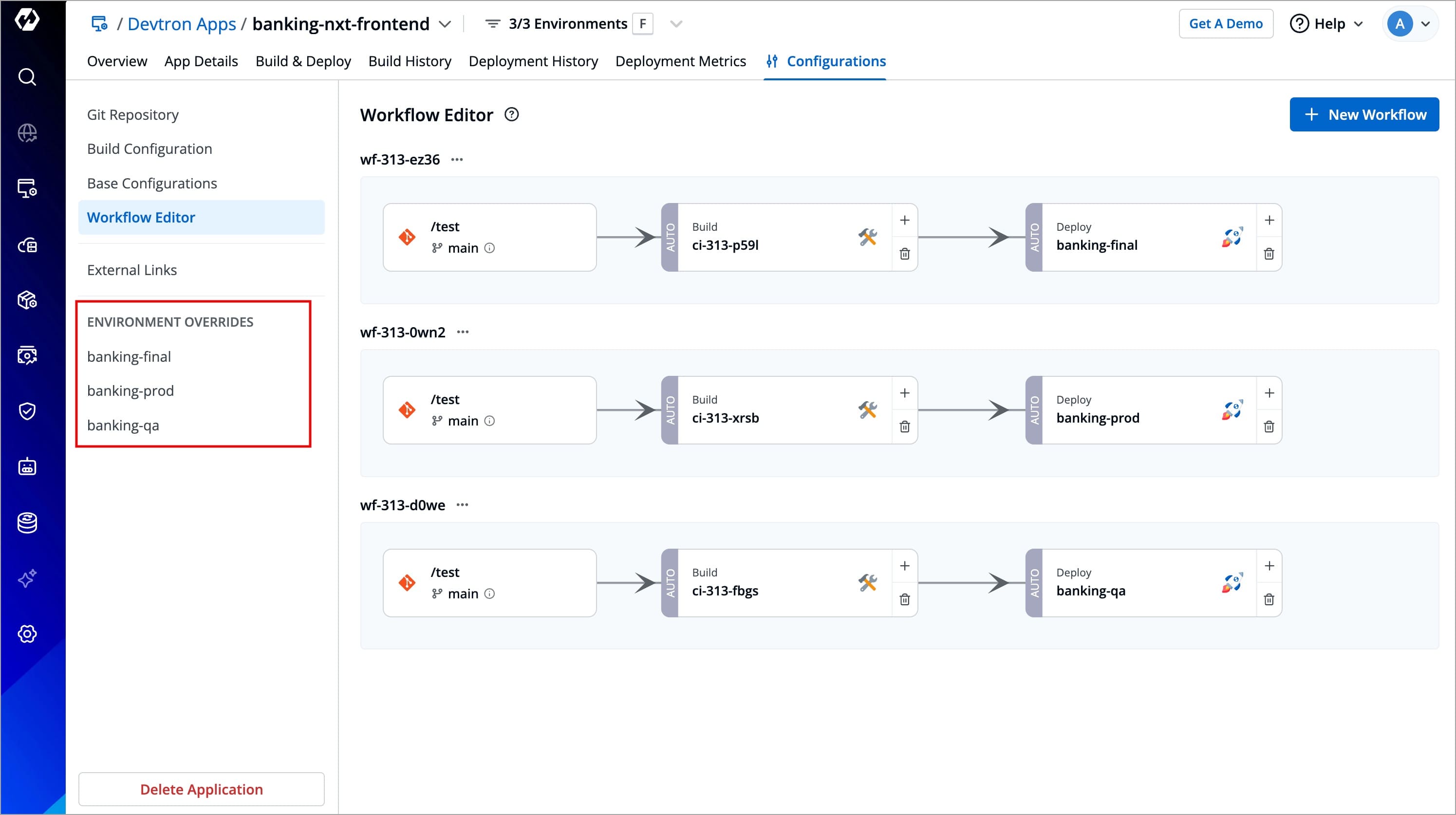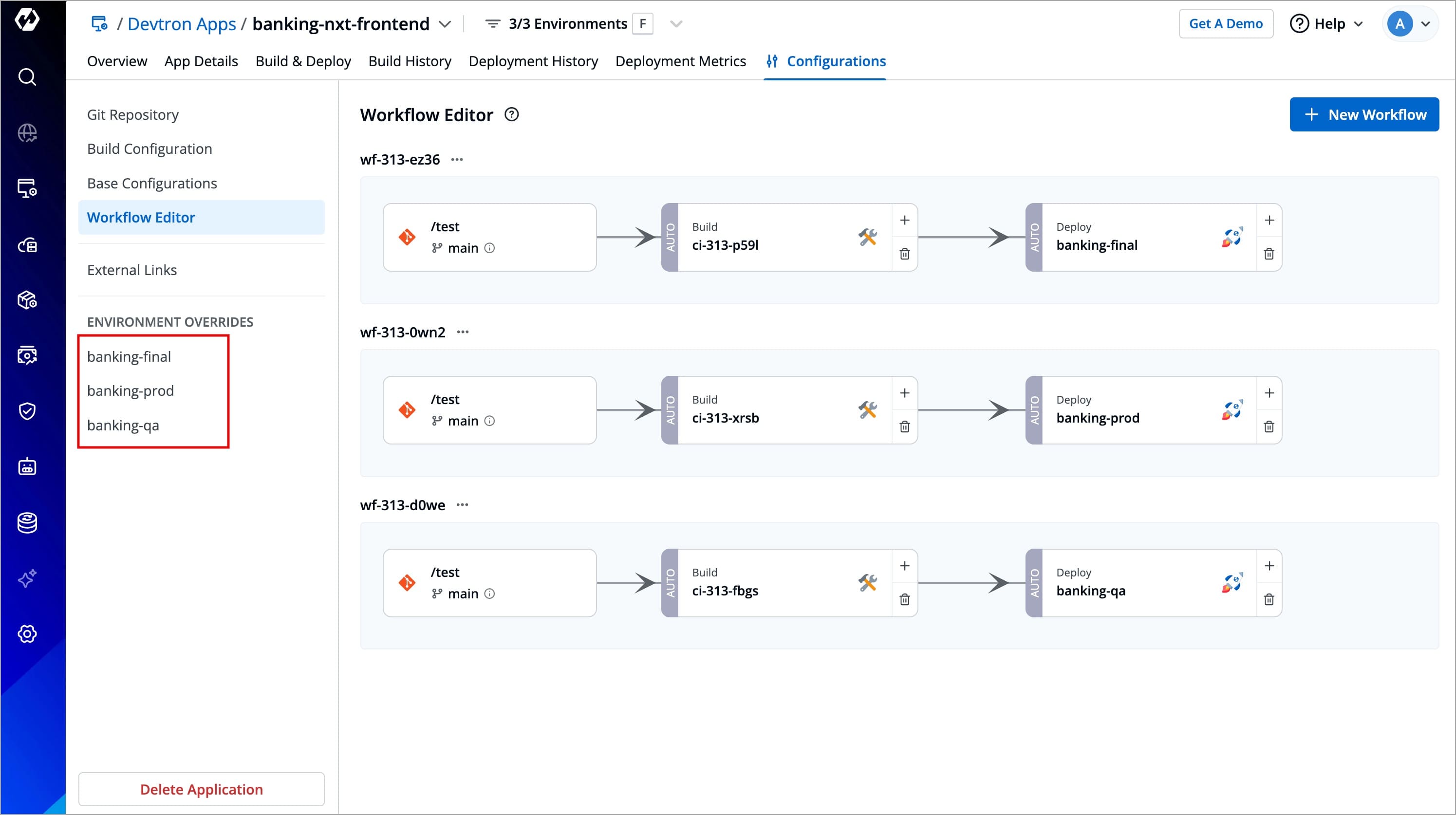 When you add a deployment pipeline to an application's workflow, each environment configuration initially inherits the Deployment Template, ConfigMap and Secret from the Base Configurations of the application.