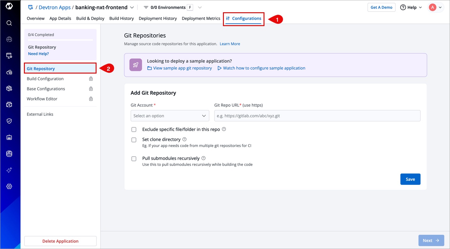 In your Devtron app, go to Configuration (tab) → Git Repository. You will get the following fields and options: