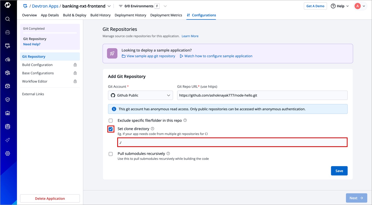Repeat the process for every new git repository you add. The clone directory path is used by Devtron to assign a directory to each of your Git repositories. Devtron will clone your code at those locations and those paths can be referenced in the Docker file to create a Docker image of the application.