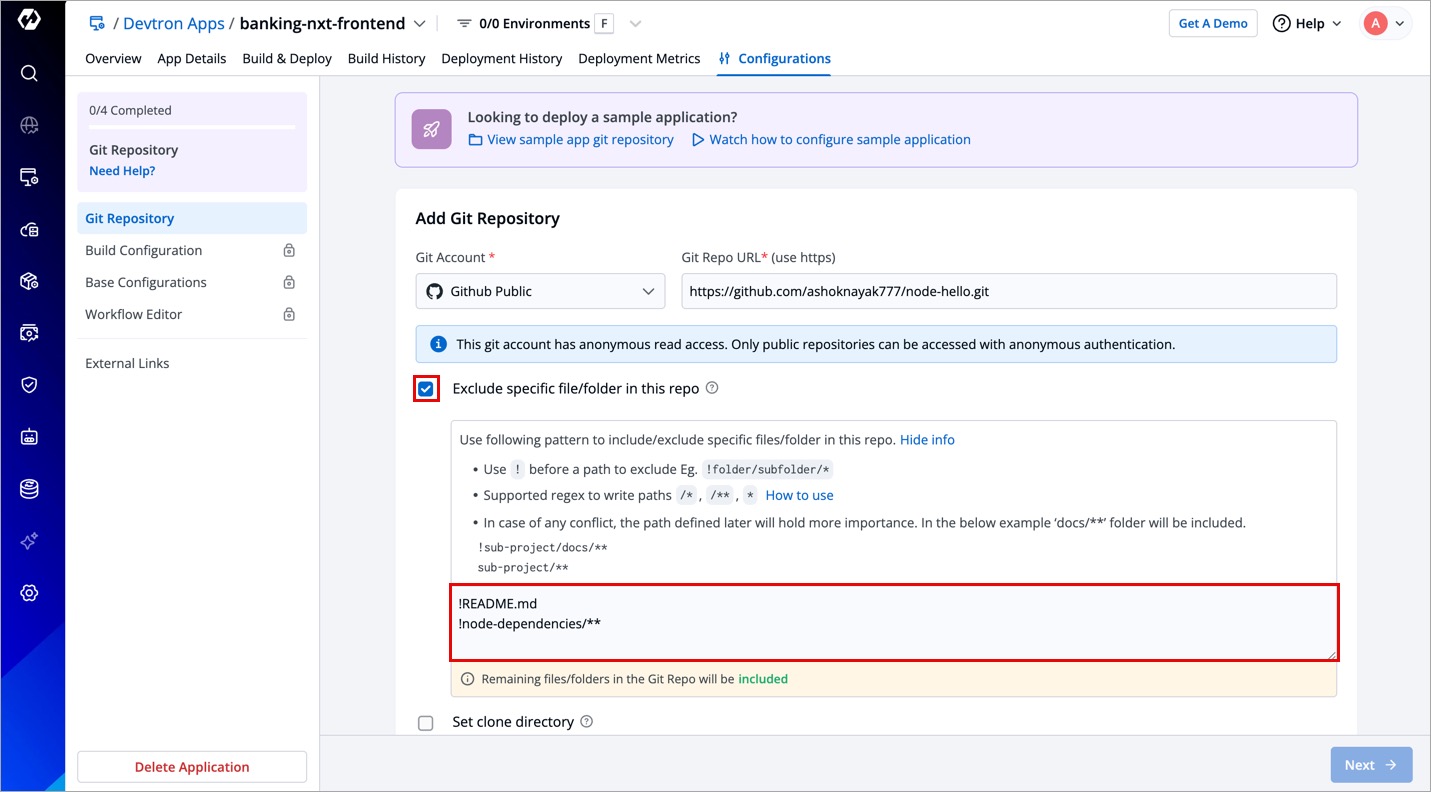 Devtron allows you to create either an exclusion rule, an inclusion rule, or a combination of both. In case of multiple files or folders, you can list them in new lines.