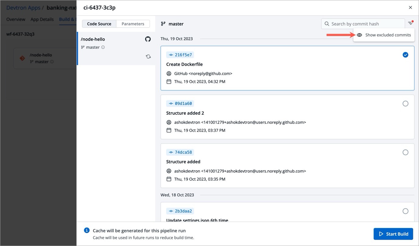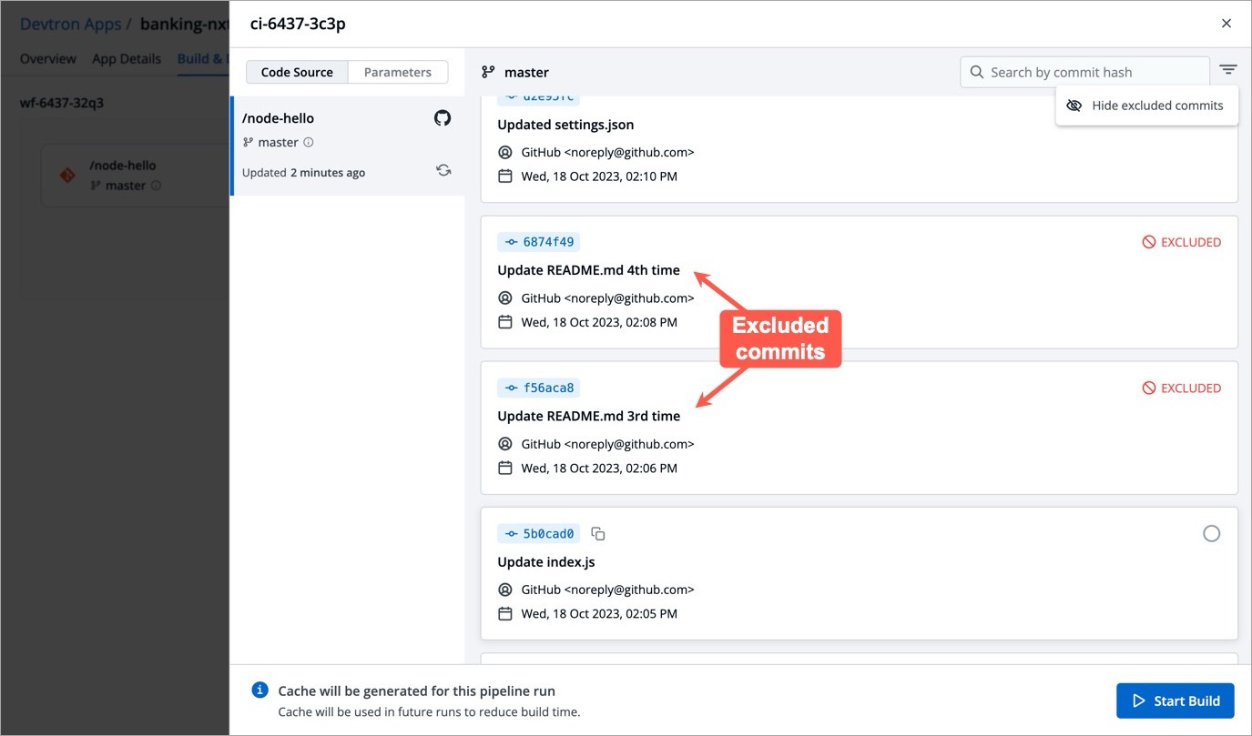 However, Devtron gives you the option to view the excluded commits too. There's a döner menu at the top-right (beside the Search by commit hash search bar).