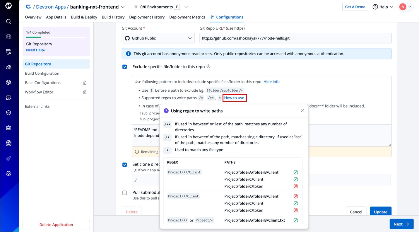 Since file paths can be long, Devtron supports regex too for writing the paths. To understand it better, you may click the How to use link as shown below.