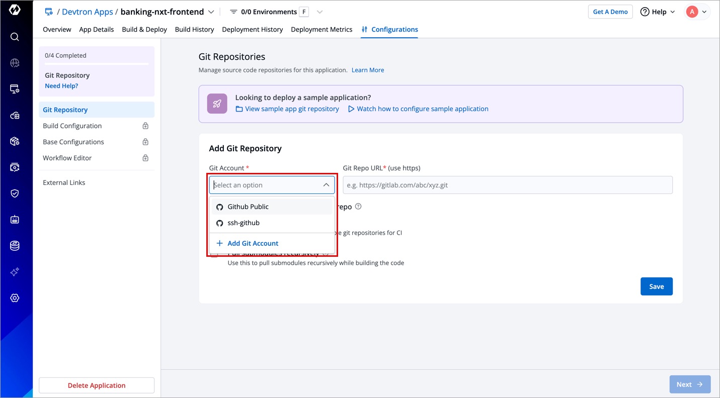Devtron also supports multiple Git repositories (be it from one Git account or multiple Git accounts) in a single deployment.