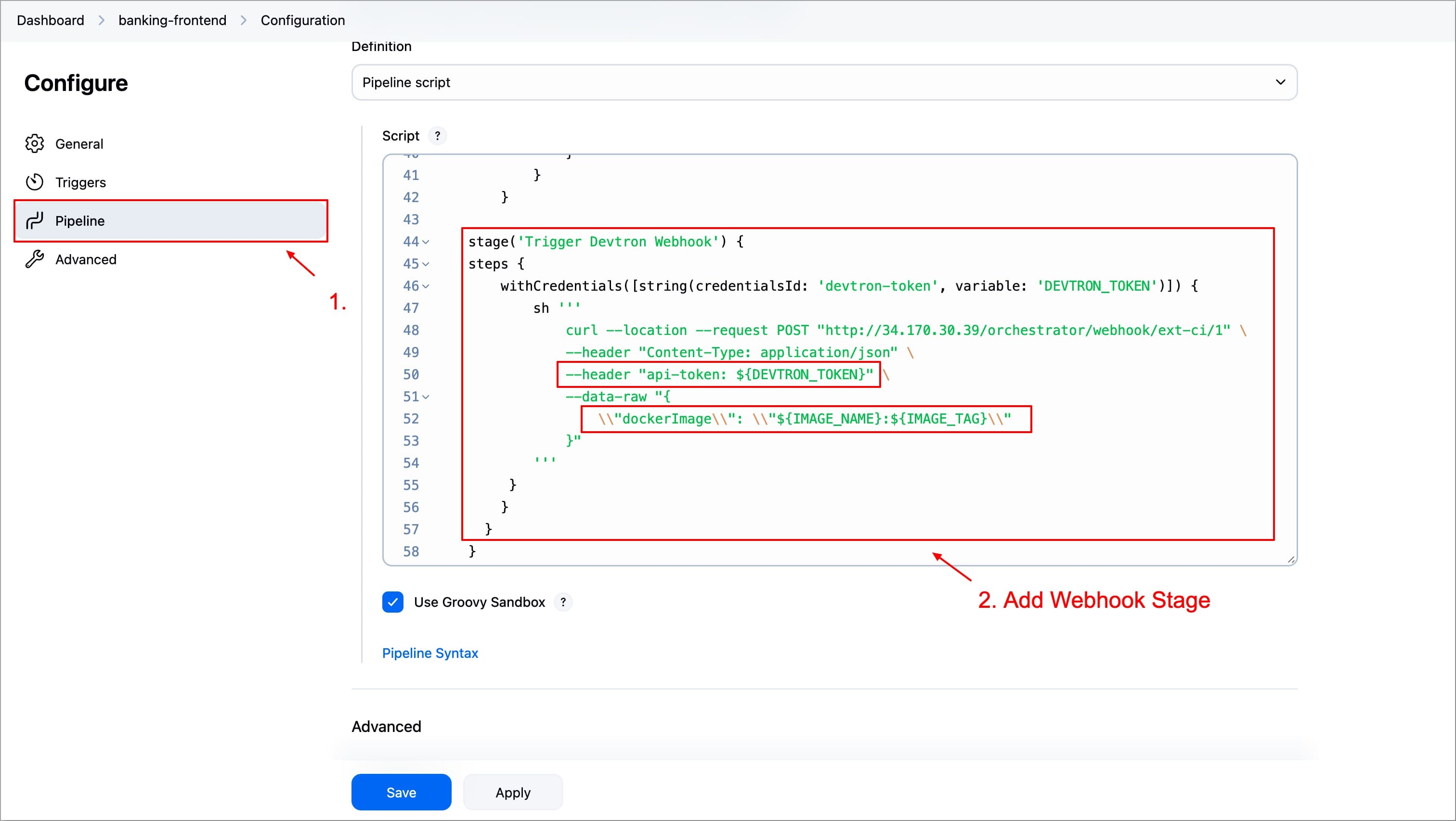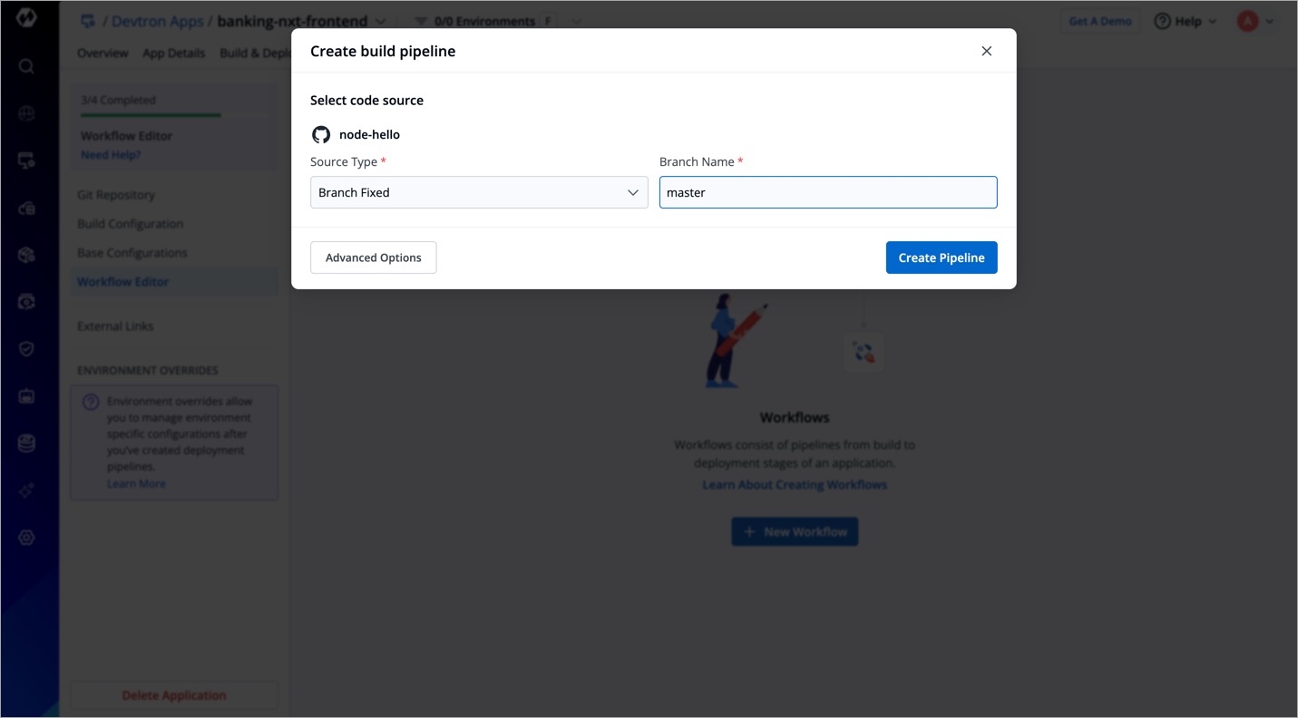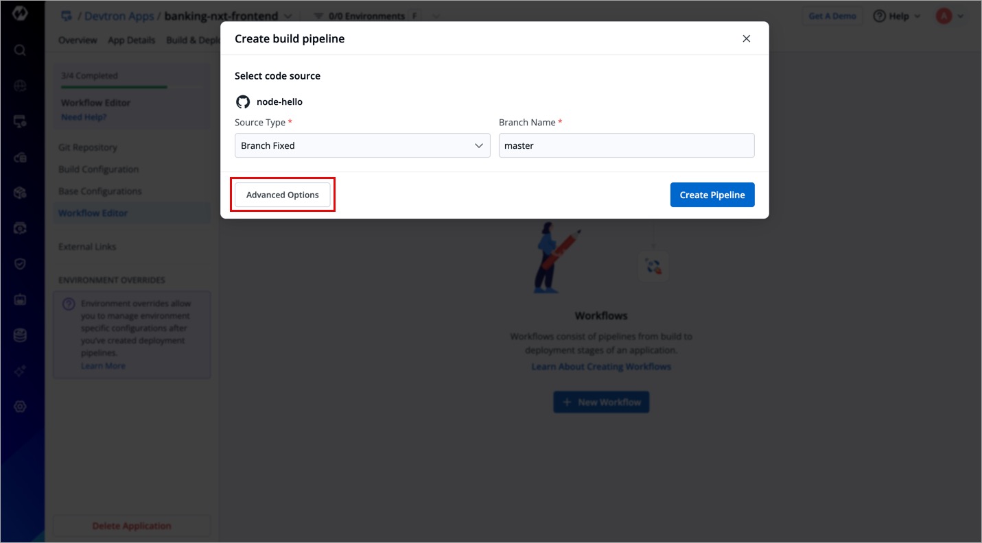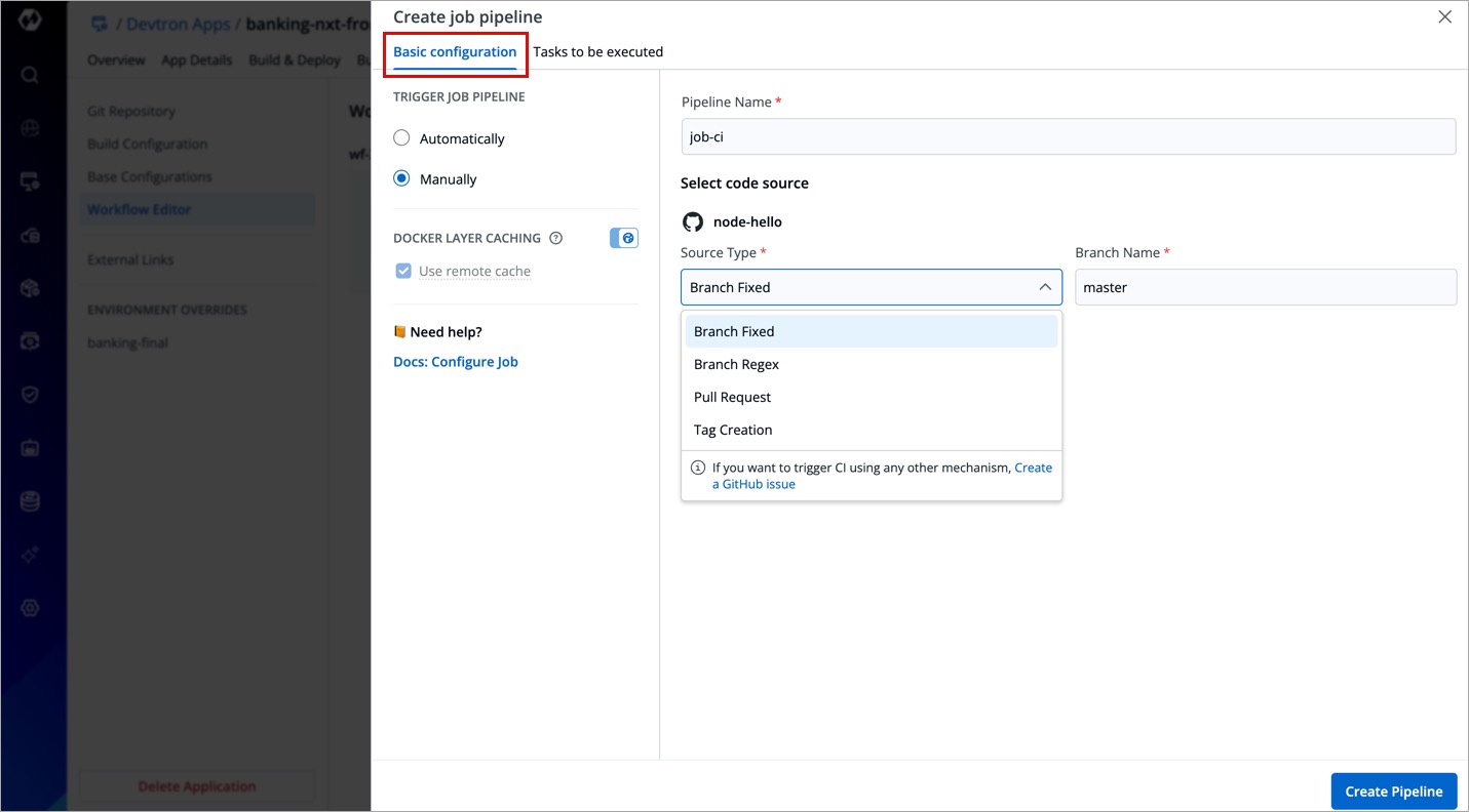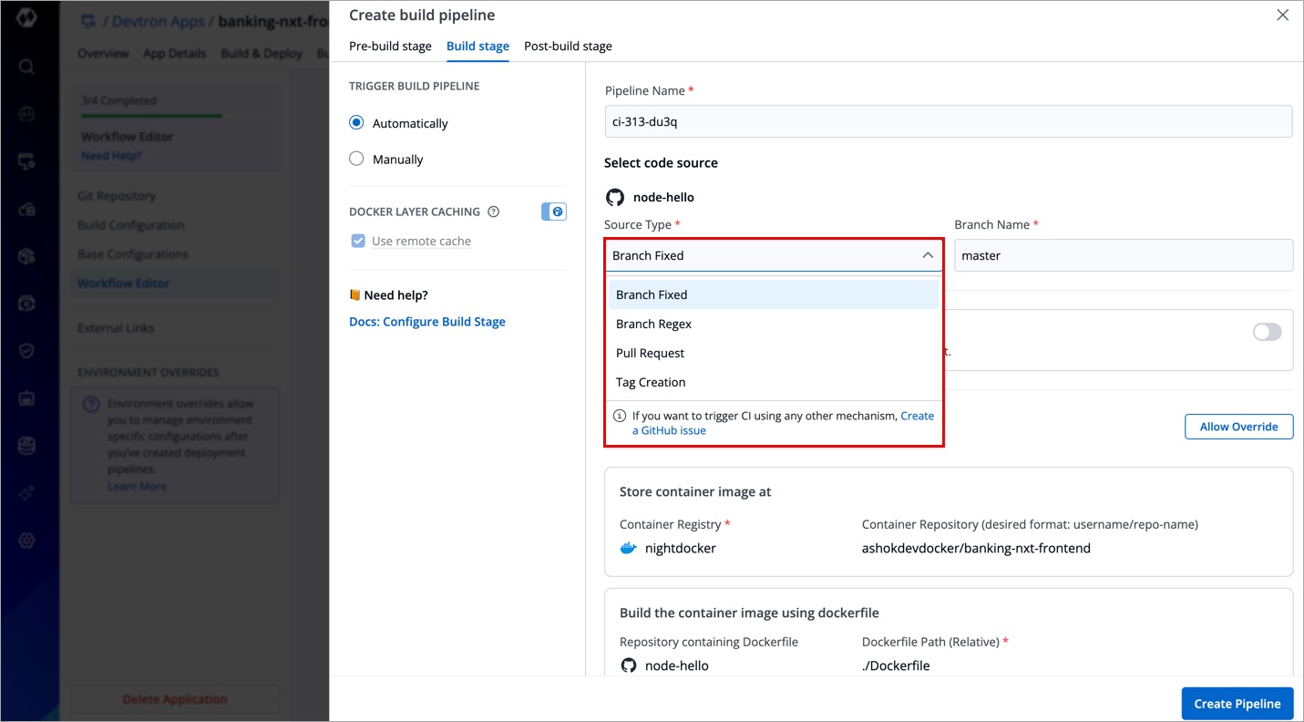 Figure 3: Configuring build pipeline Field Name Required/Optional Description Pipeline NameRequired (Auto-Assigned) Devtron automatically assigns a unique name for the pipeline. If you wish, you can change it in Advanced Options Source typeRequired Source type to trigger the CI. Available options: Branch Fixed,Branch Regex,Pull Request,Tag CreationBranch NameRequired Branch that triggers the CI build Advanced OptionsOptional Create Pre-Build, Build, and Post-Build tasks