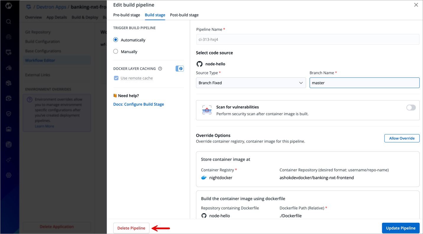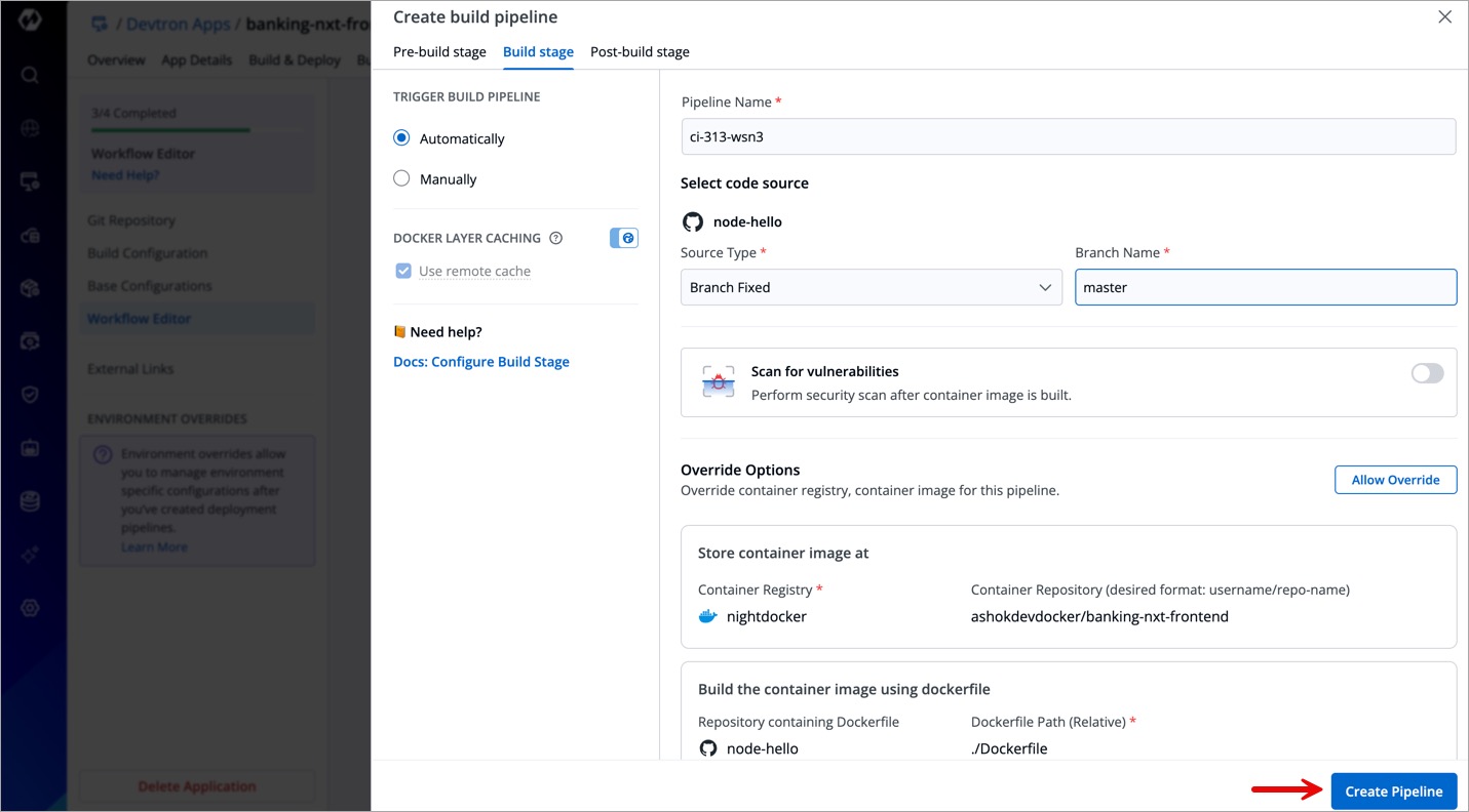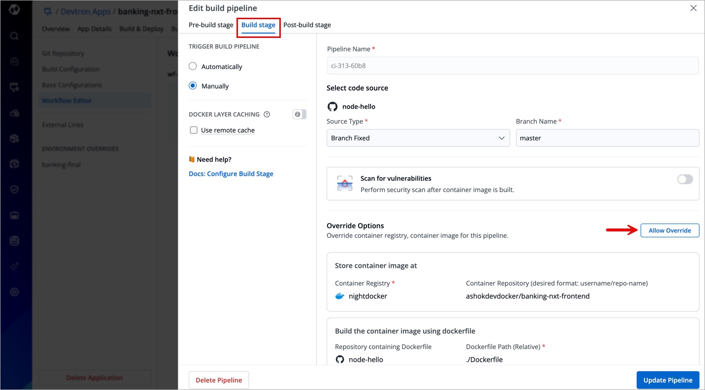 Override OptionsOptional Allows overriding configurations from earlier stages like CRI configuration, target platform configuration, etc. Docker build argumentsOptional Override docker build configurations for this pipeline.