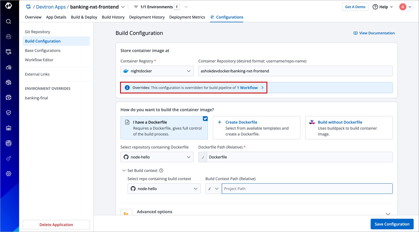 To override this Build configuration for the specific workflow (testing workflow), you can use Override Options in the Build Stage of that workflow that lets you specify different container registries, how to build container images, and target platforms for different workflows of the same application. This means the images built for testing environment can be included to the testing registry and the images for production environment can be included to the production registry. This helps keep environments isolated, improves deployment safety, and makes managing multiple environments easier.