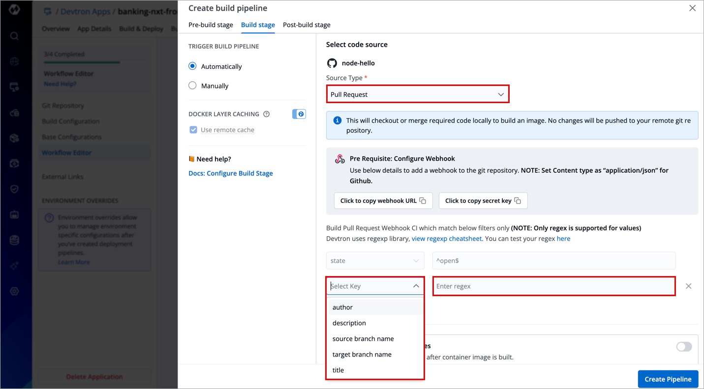When using Pull Request as a source type, Devtron allows you to filter which PRs should trigger a build using the following filters