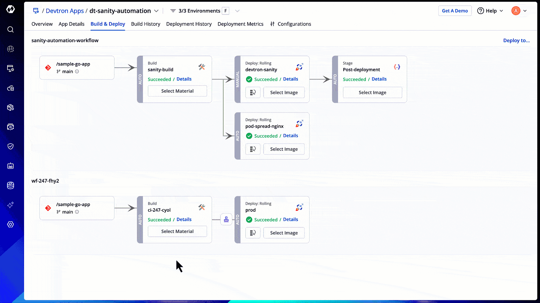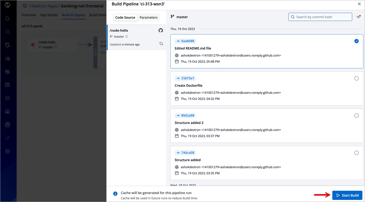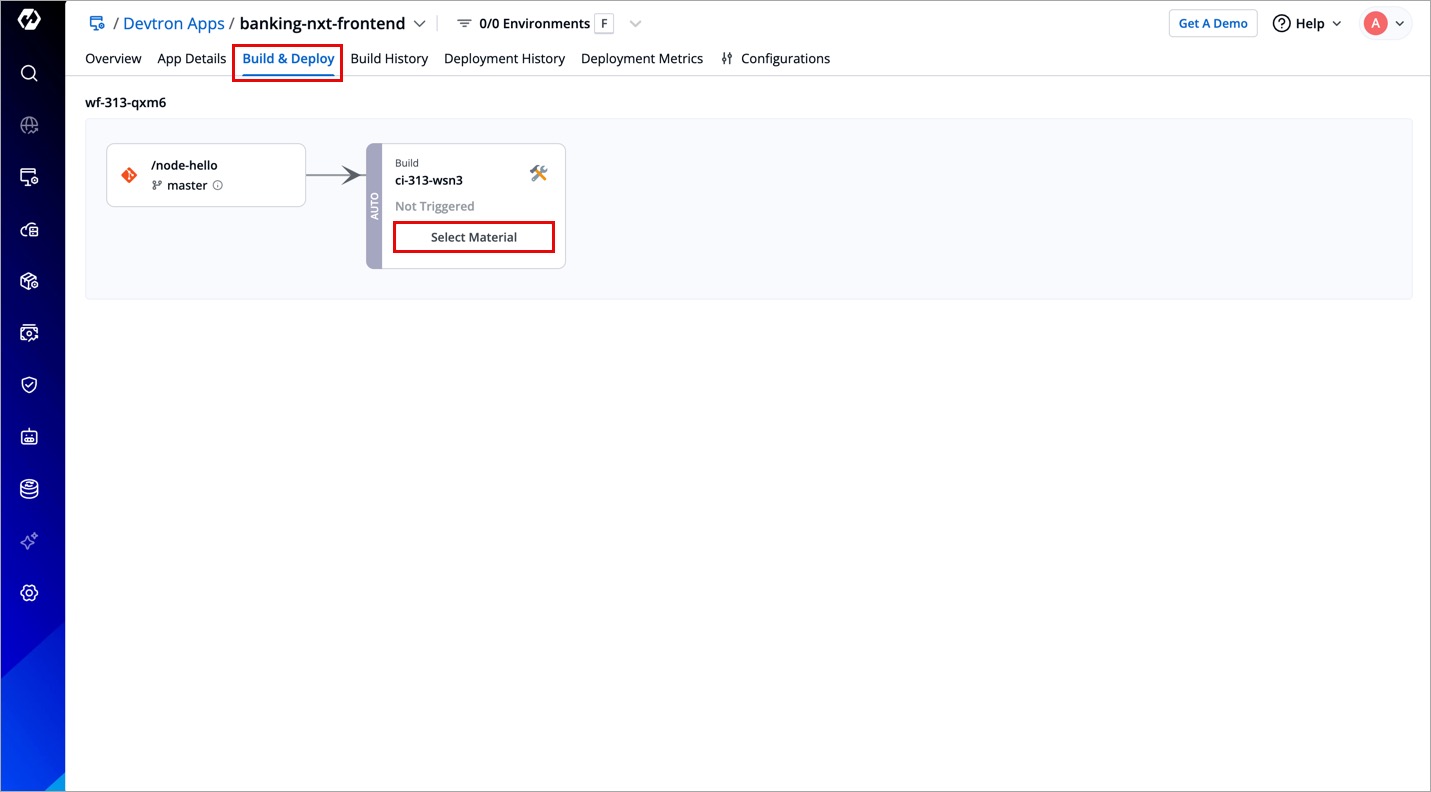 - After configuration, trigger a build by navigating to Build & Deploy, selecting the Git commit by clicking on Select Material, and clicking Start Build.
