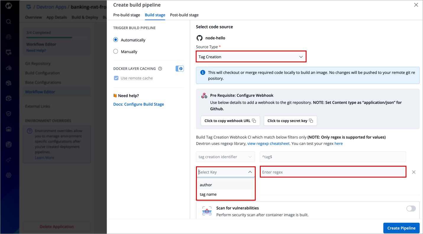If you choose Pull Request or Tag Creation as the Source Type, you must first configure the Webhook for GitHub/Bitbucket as a prerequisite step.
