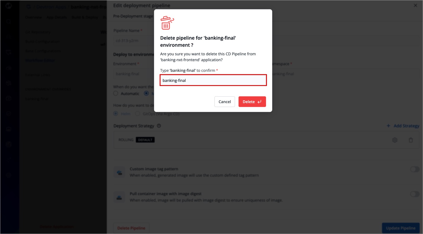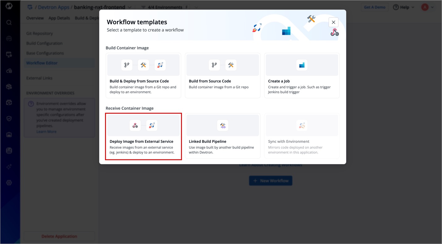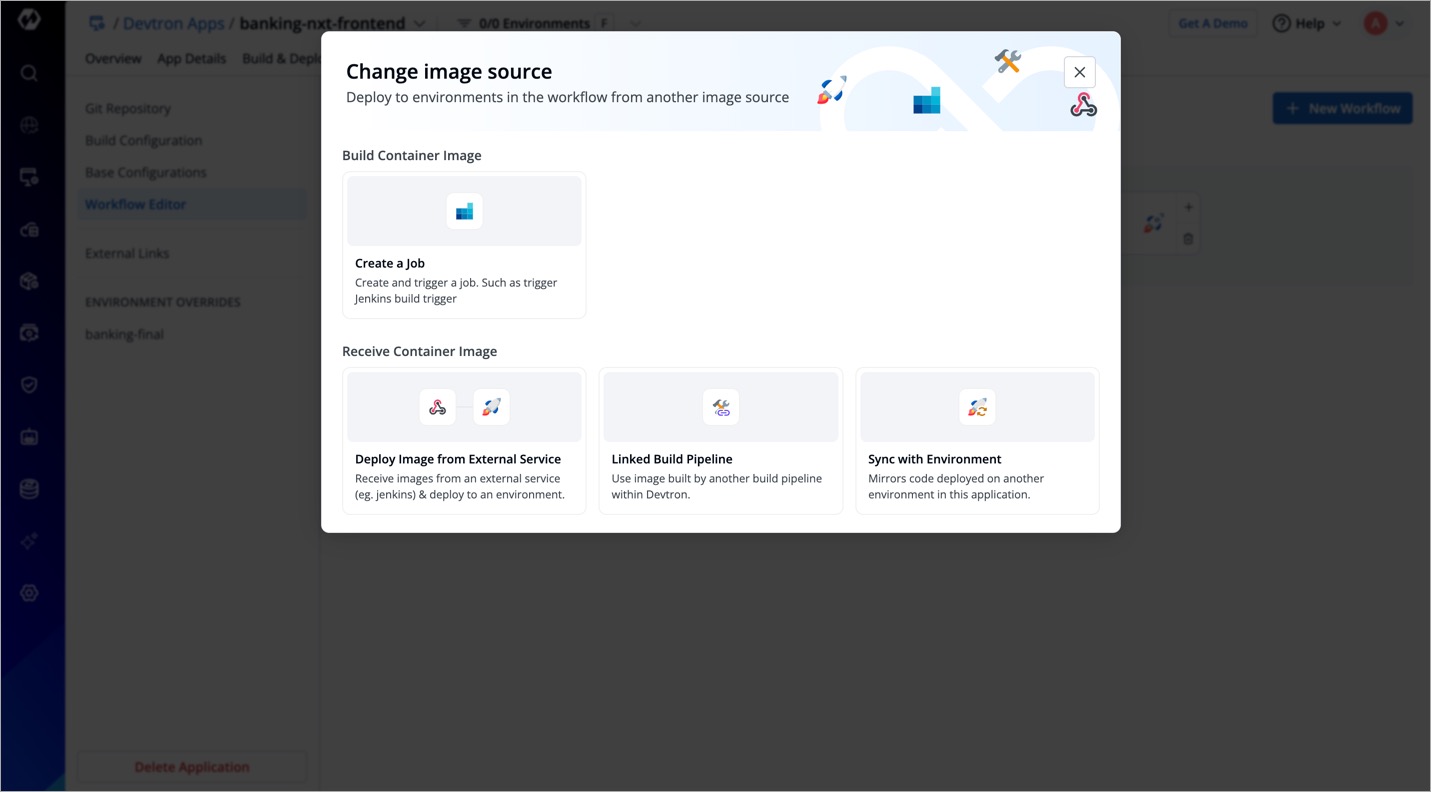 The Change Image Source feature in Devtron lets you update the container image source for an applicationβs workflow without modifying it.