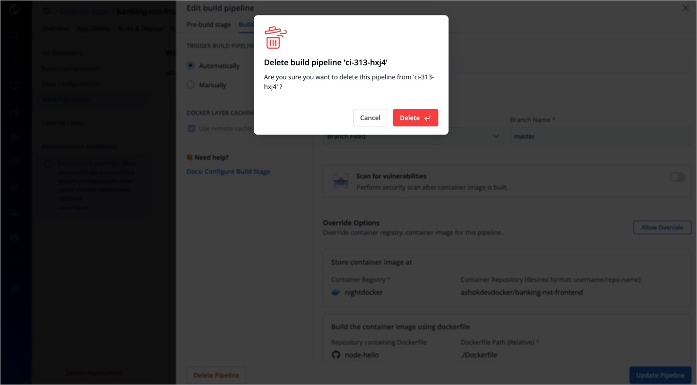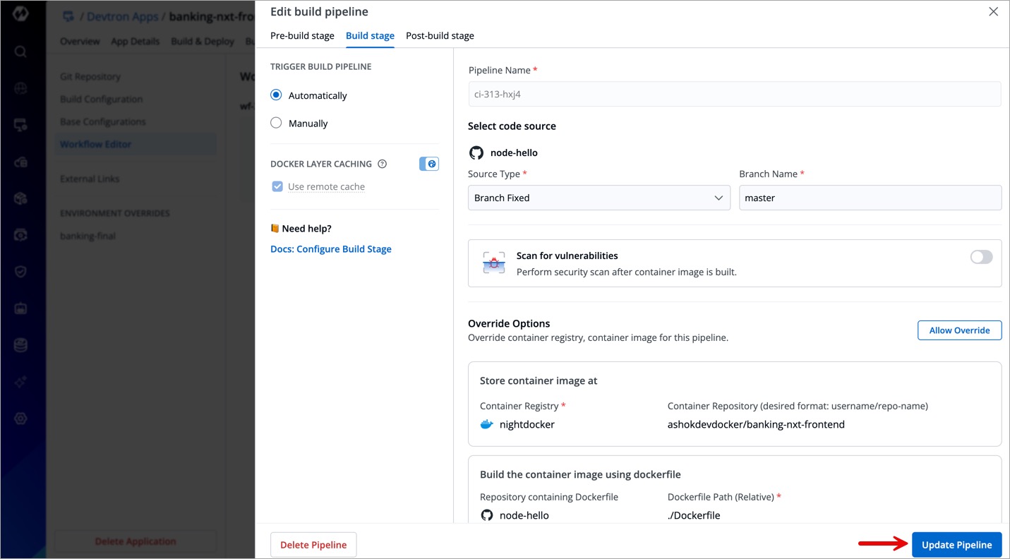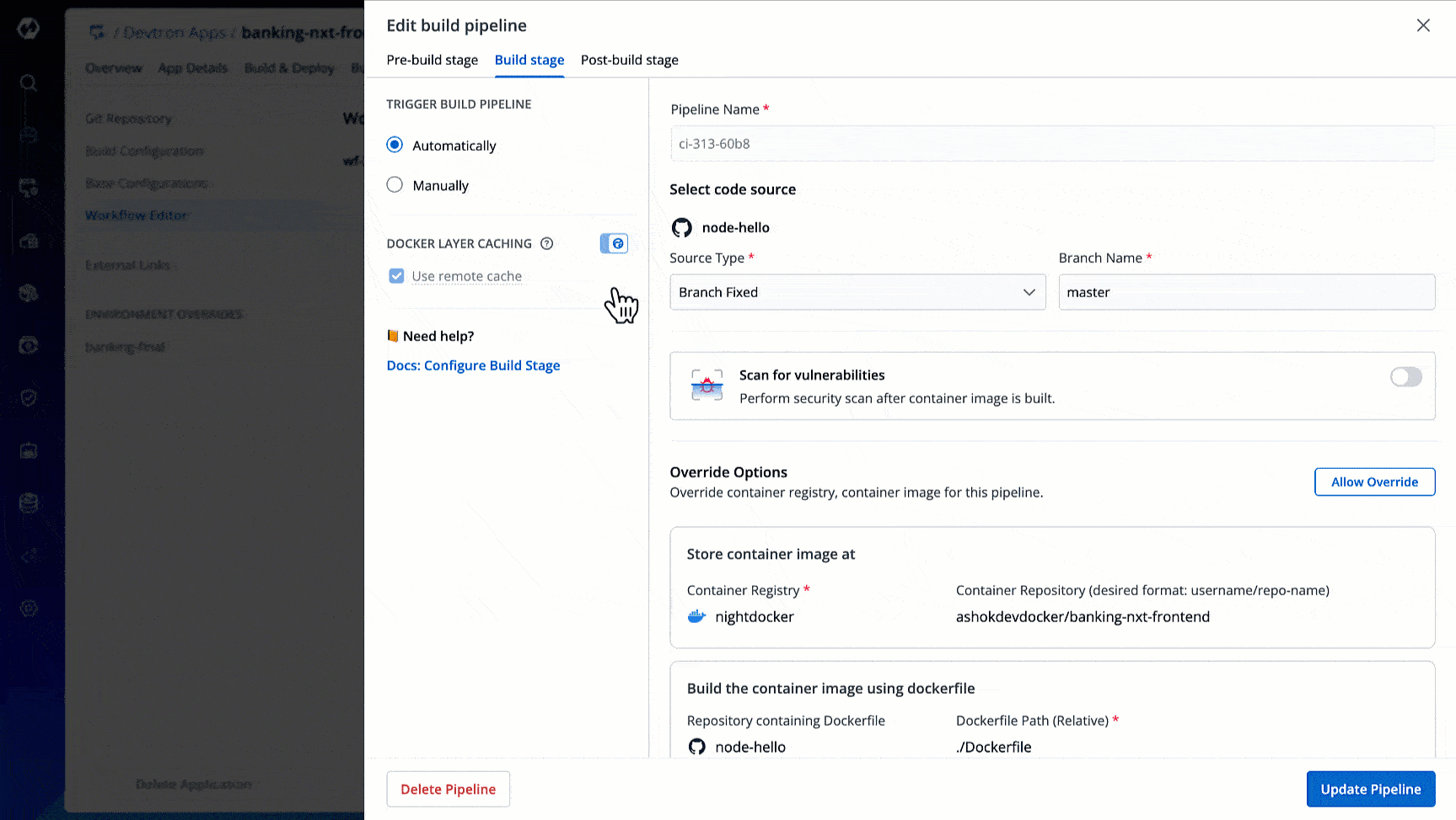 DOCKER LAYER CACHING Optional Use this to enable/disable caching of docker image layers from your build pipeline Pipeline NameRequired Devtron automatically assigns a unique name for the pipeline, if you wish, you can edit it here. Scan for VulnerabilitiesOptional Prerequisite: Install either Clair or Trivy.