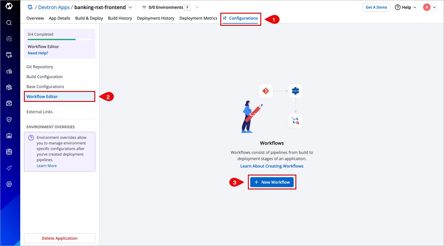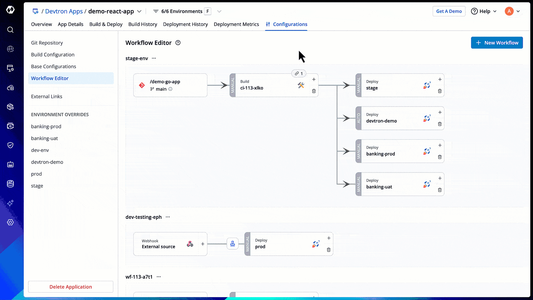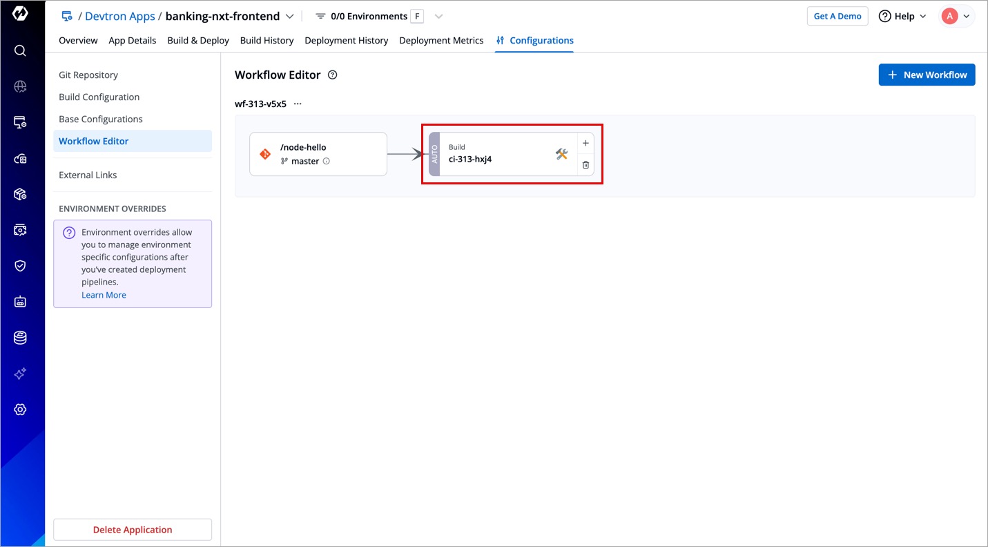 Override Options in Build Stage lets you override Build Configurations for each workflow of the same application. You can configure overrides in the build stage of each workflow.