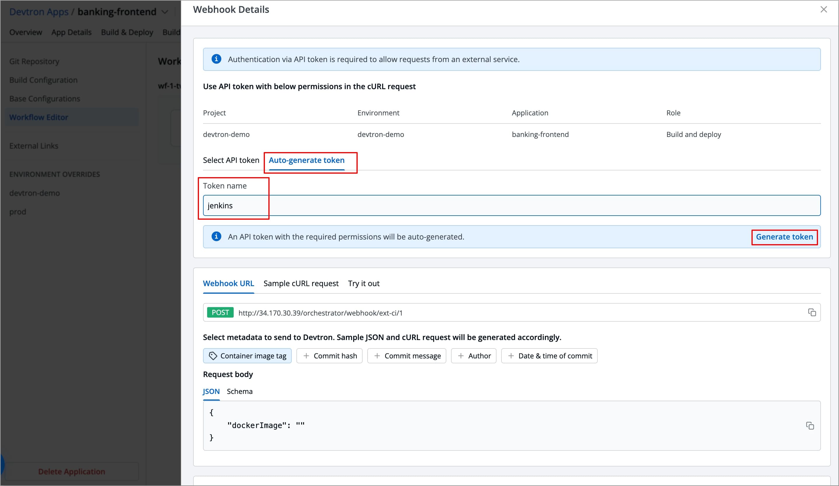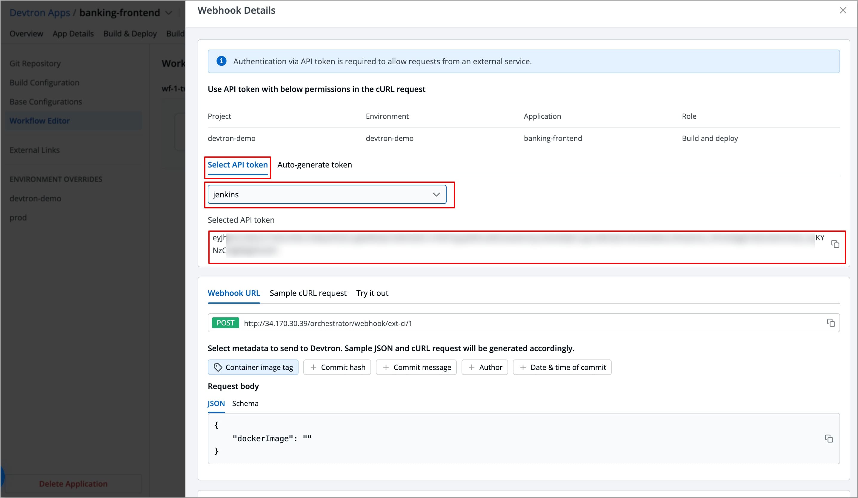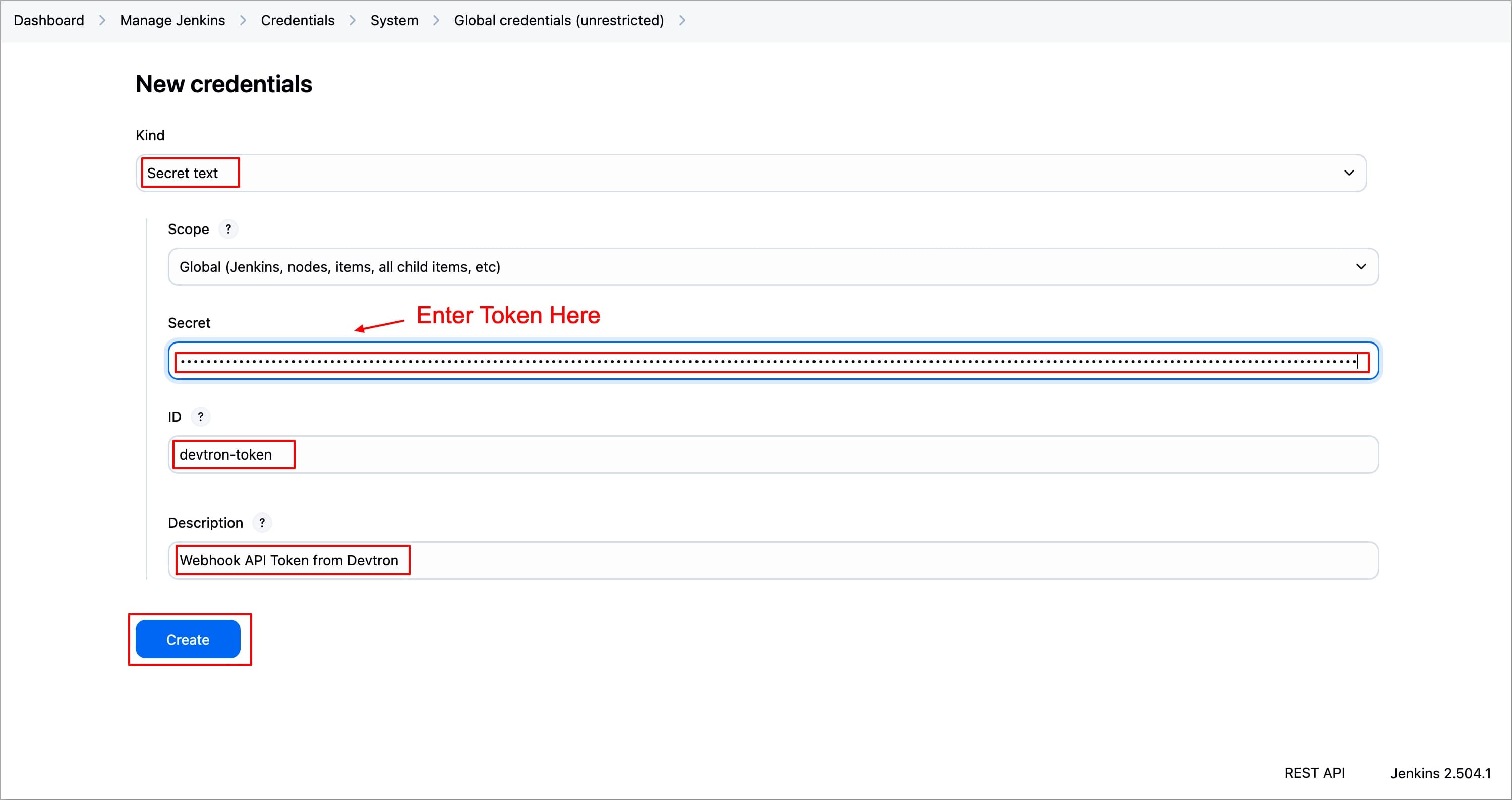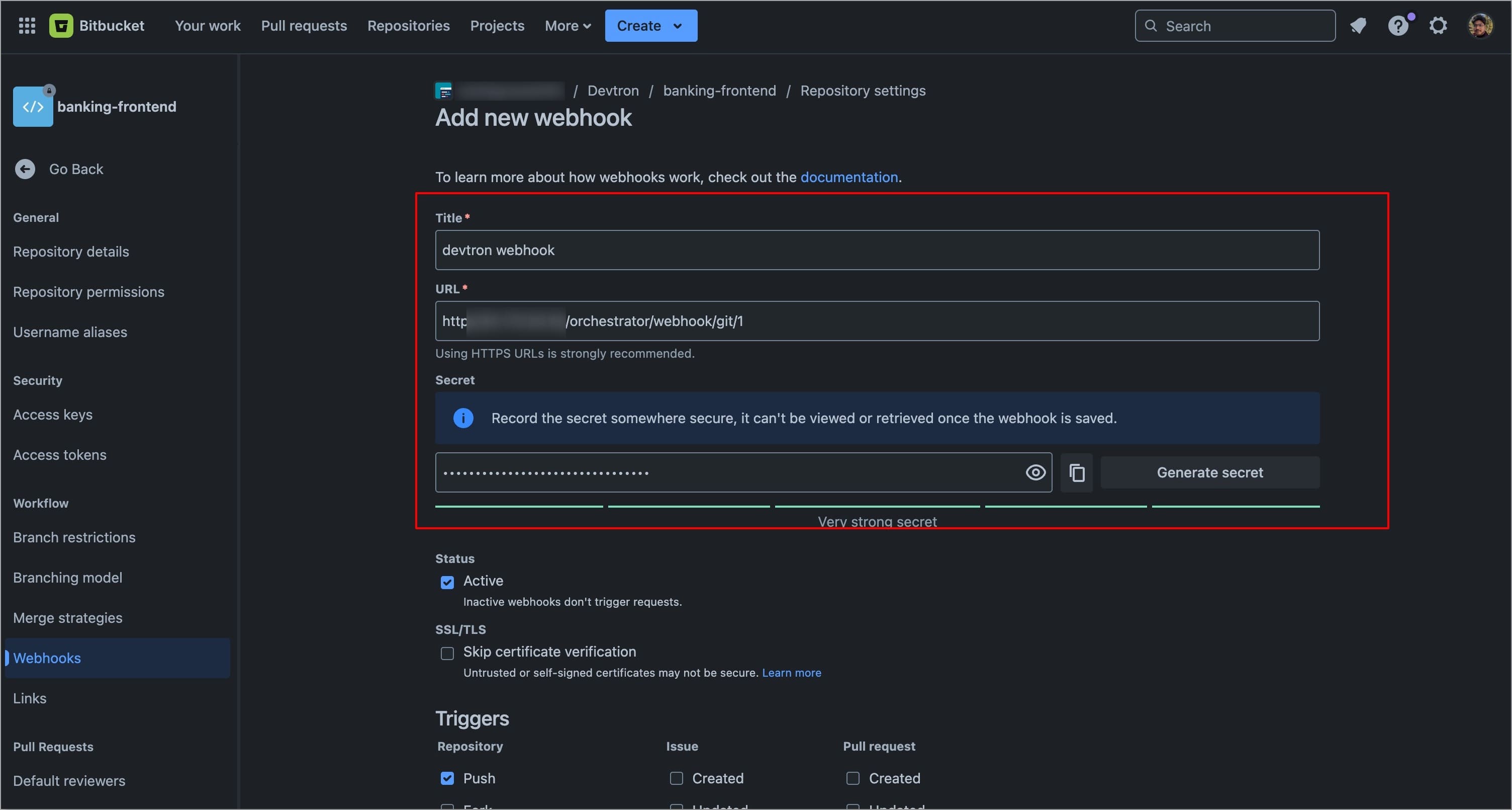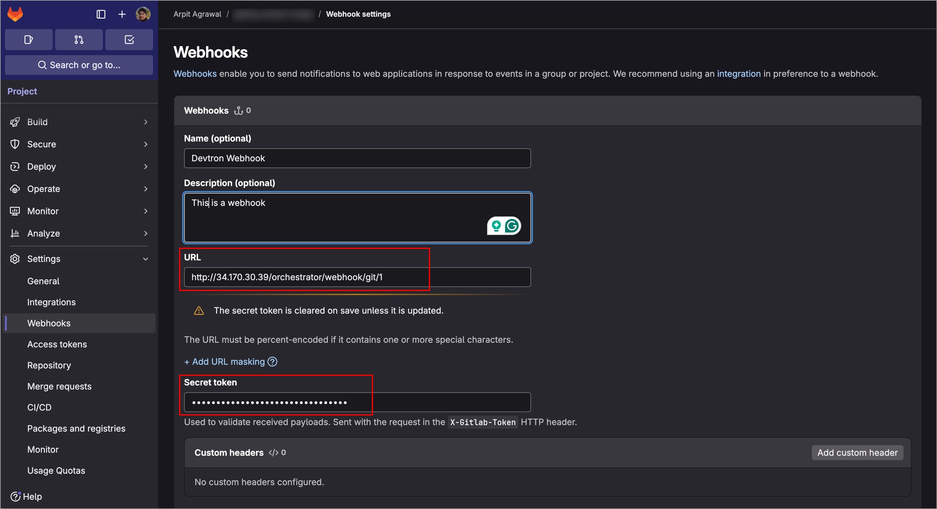 In the Secret token field, enter the secret from the Devtron dashboard when you select the source type as "Pull Request" or "Tag Creation".