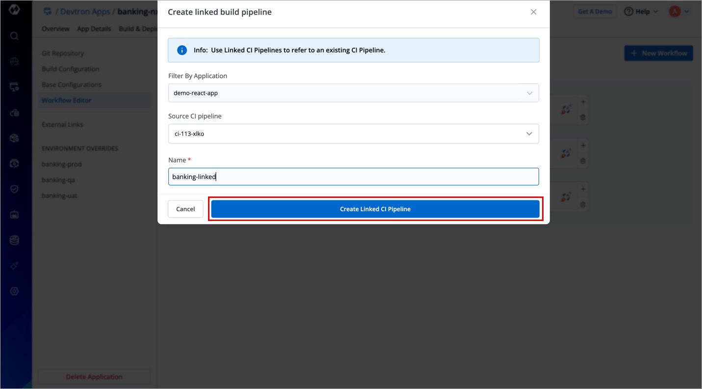 - In case the source pipeline exists within the same application, the Linked Build Pipeline name must be different from the source pipeline, as Devtron does not allow two pipelines with the same name within a single application.