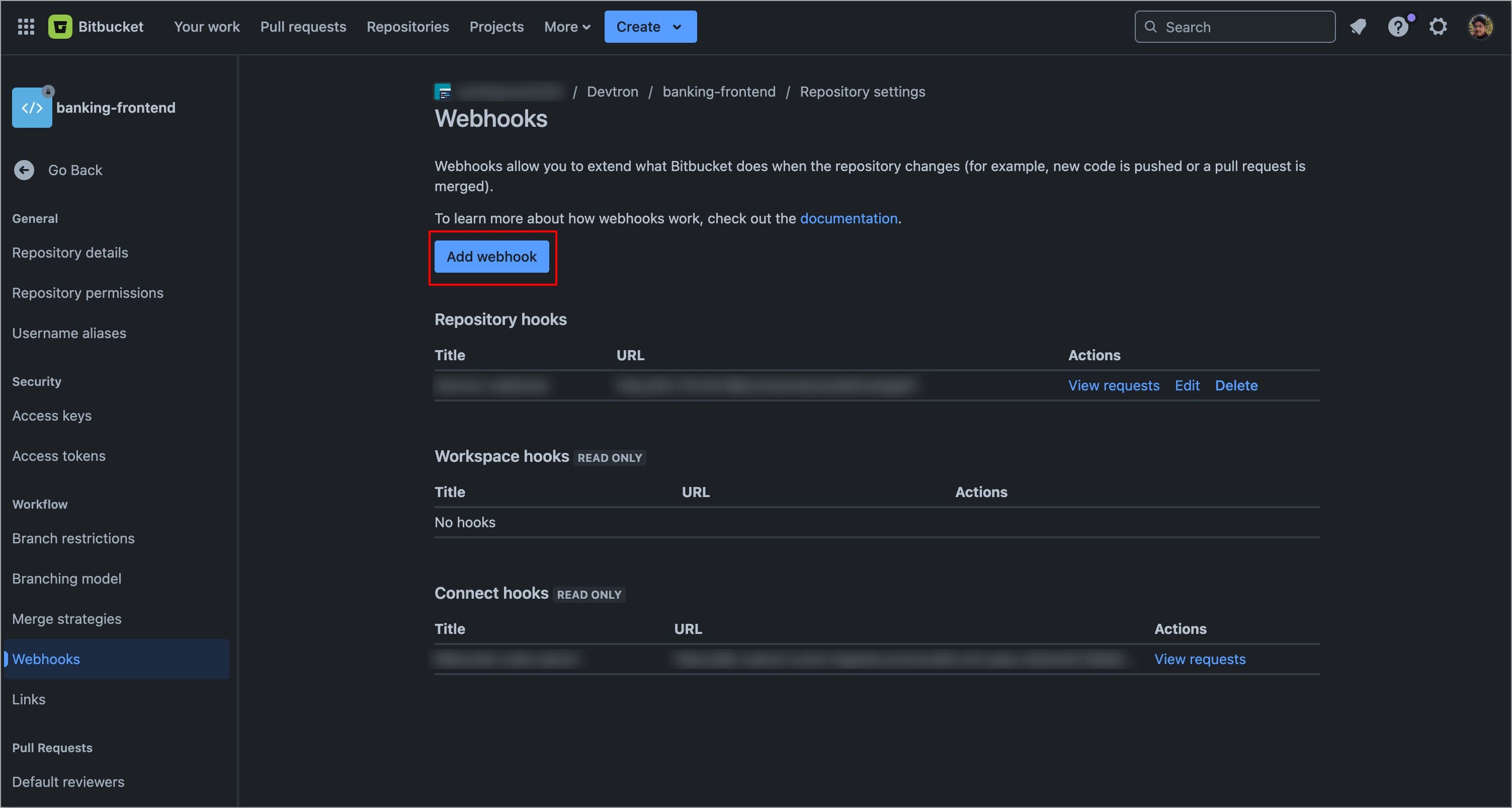 In the URL field, enter the Webhook URL that you get on selecting the source type as "Pull Request" or "Tag Creation" in the Devtron dashboard.