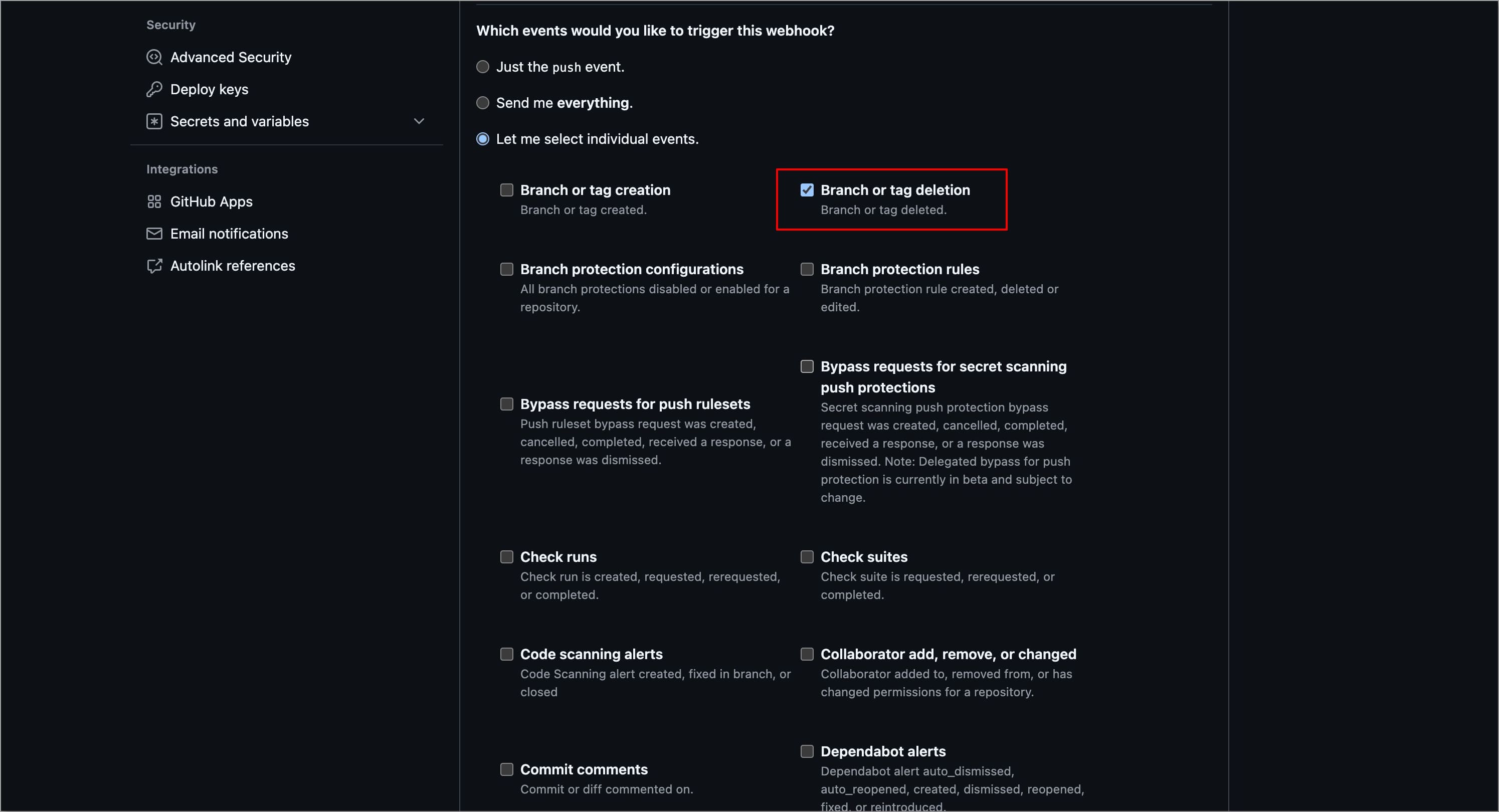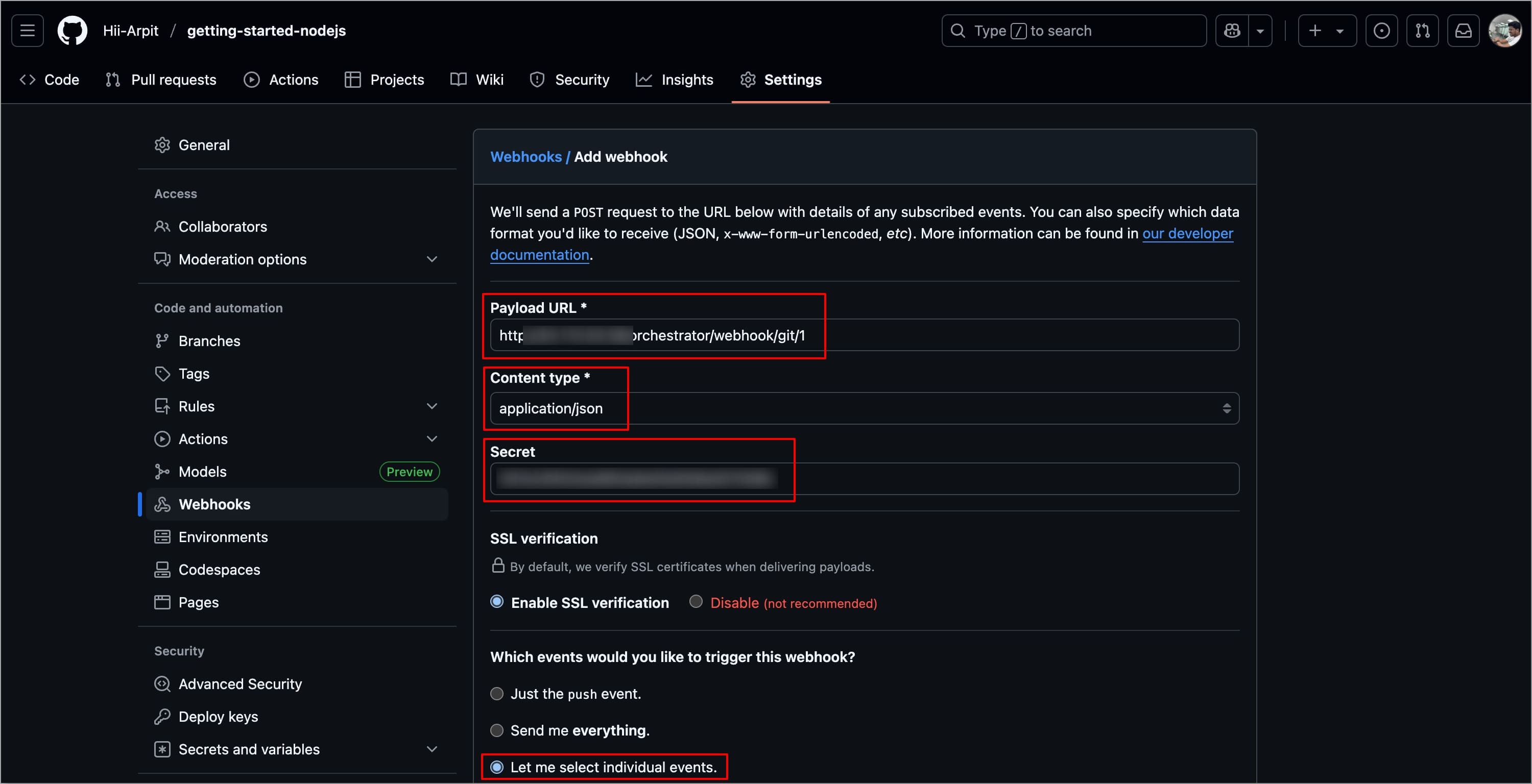 Under Which events would you like to trigger this webhook?, select Let me select individual events to trigger the webhook for specific events.