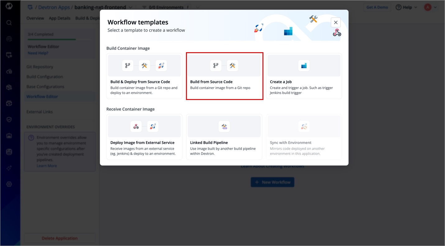Build from Source Code workflow allows you to build the container image from a source code repository.