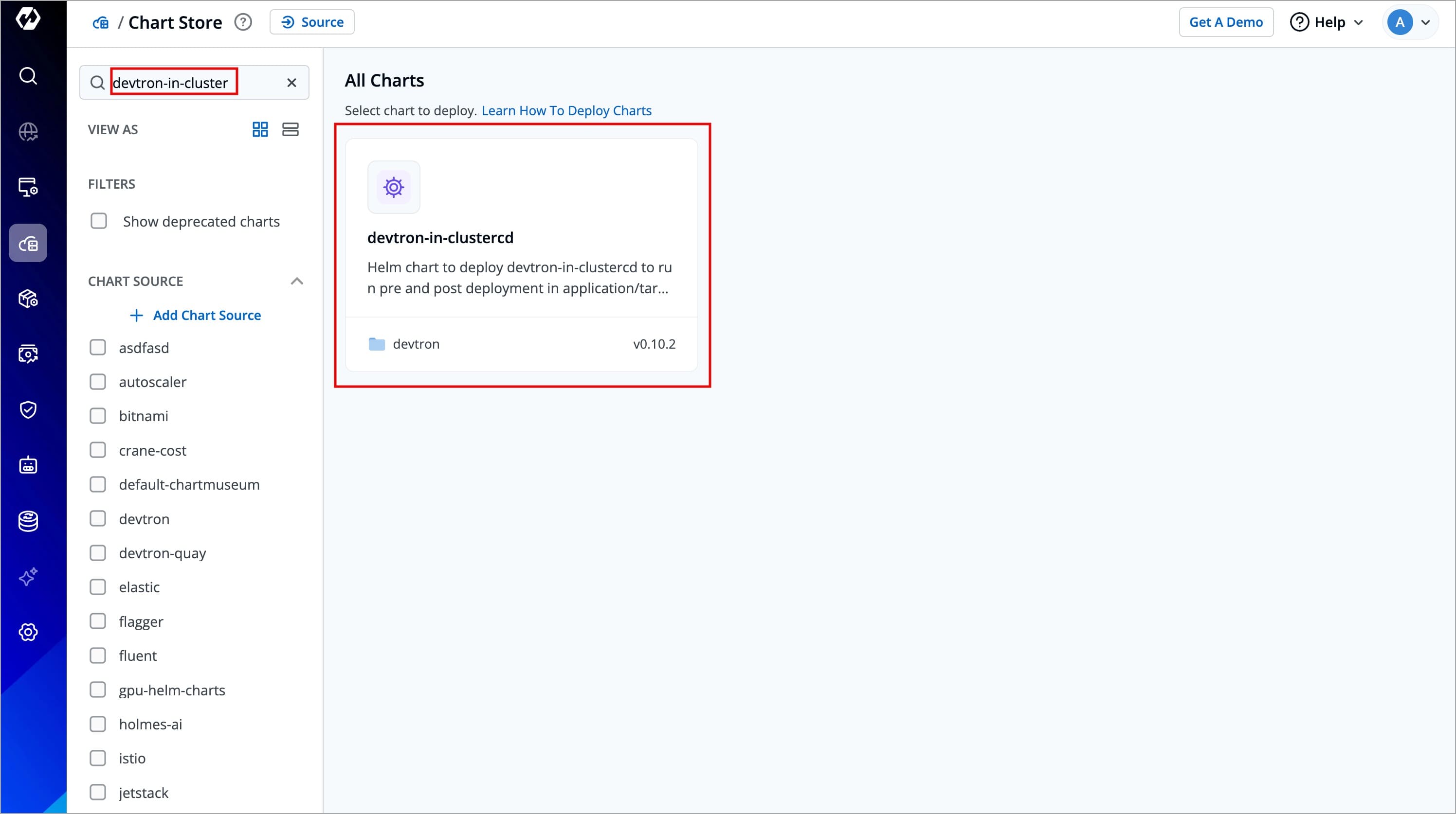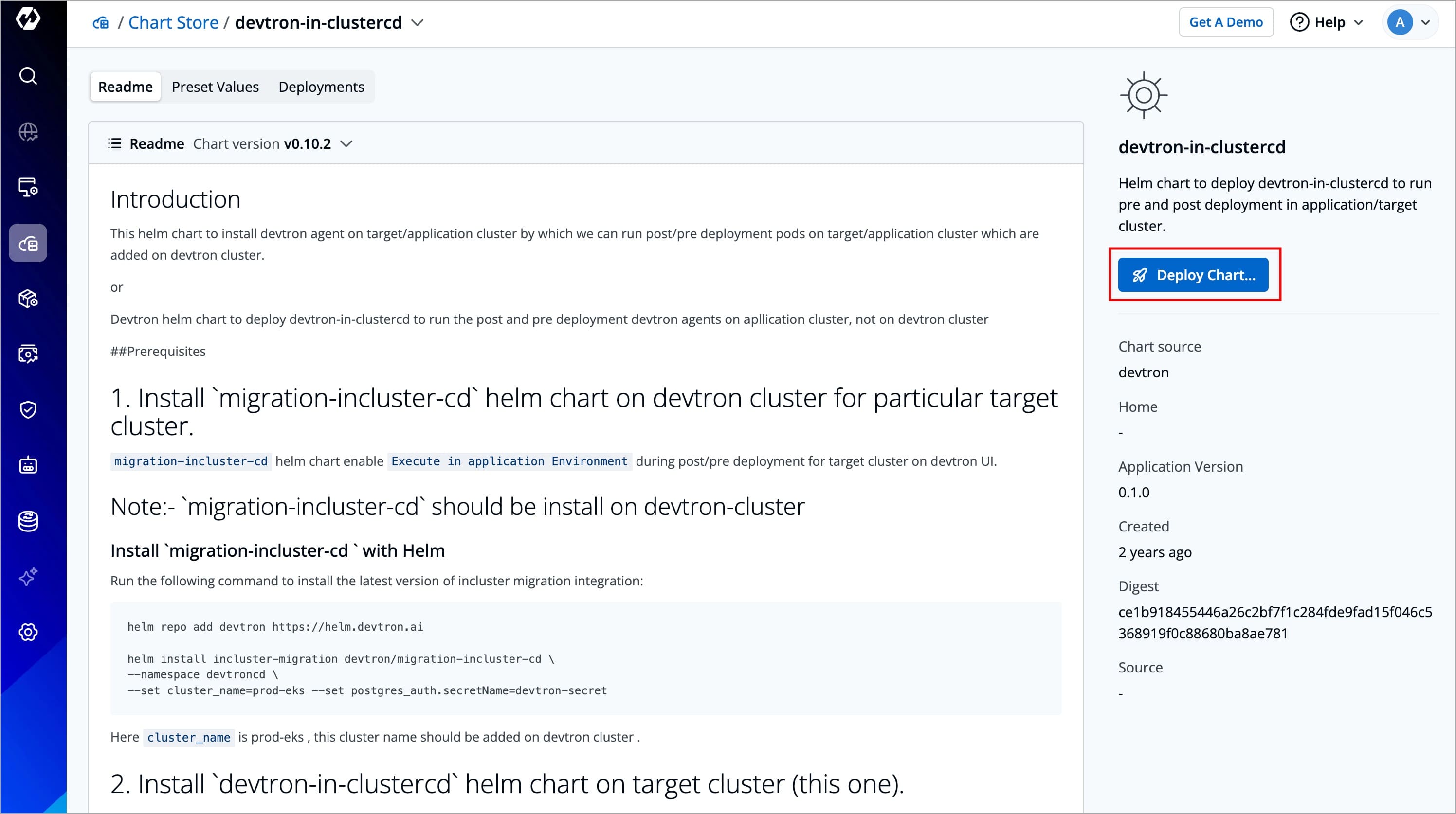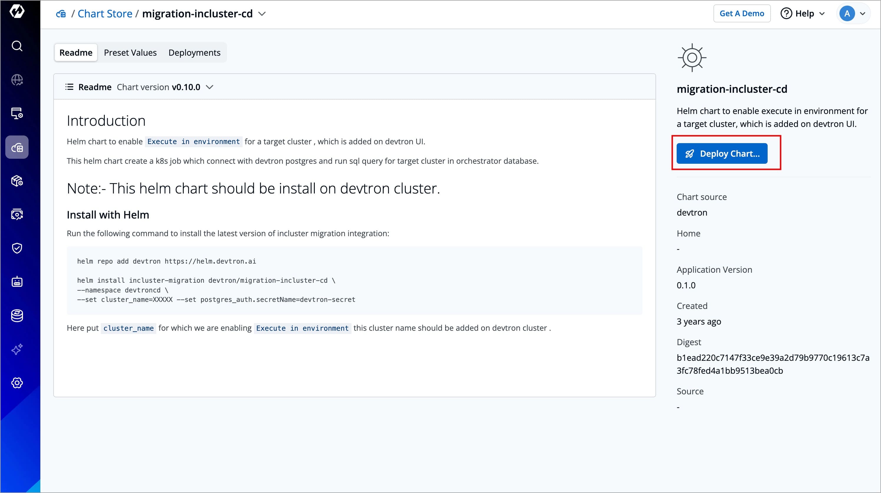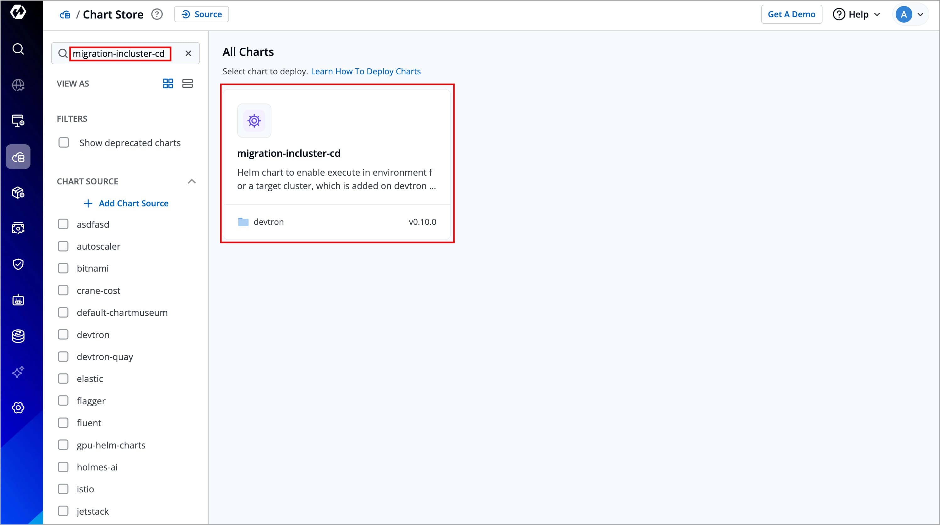 Again, navigate back to the Infrastructure Management → Chart Store and search for the "migration-incluster-cd" chart.