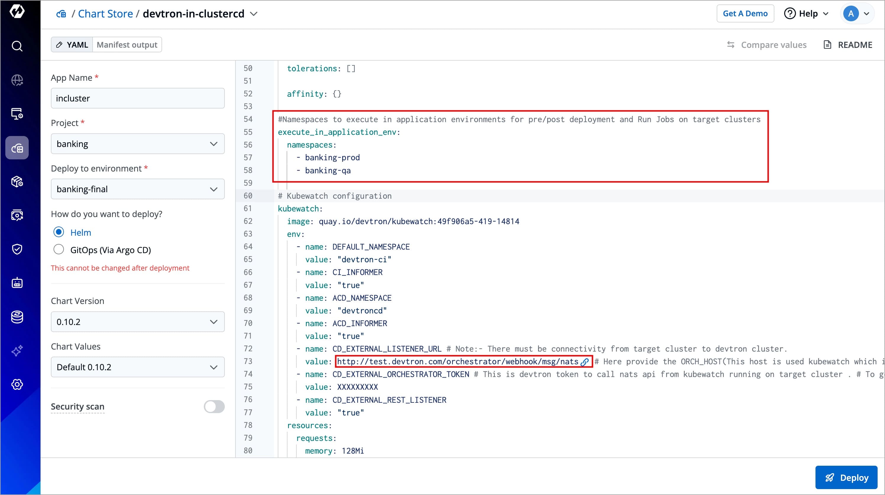 Deploy the chart in any environment within the Devtron cluster. Now you should be able to enable the