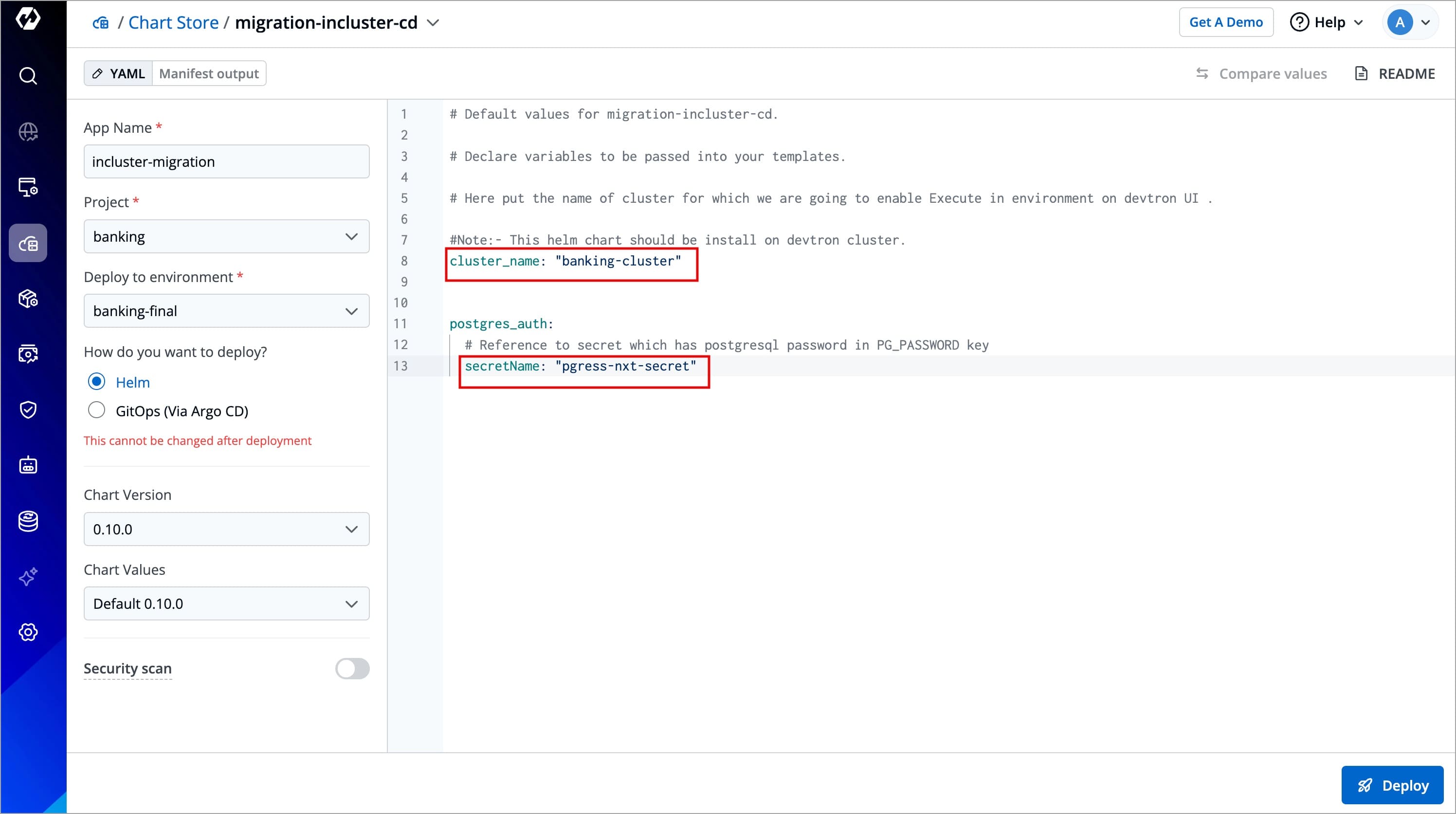 cluster-nameandsecret namevalues within the chart. Thecluster namerefers to the name used when adding the cluster in the global configuration and for which you are going to enableExecute tasks in application environmentoption.