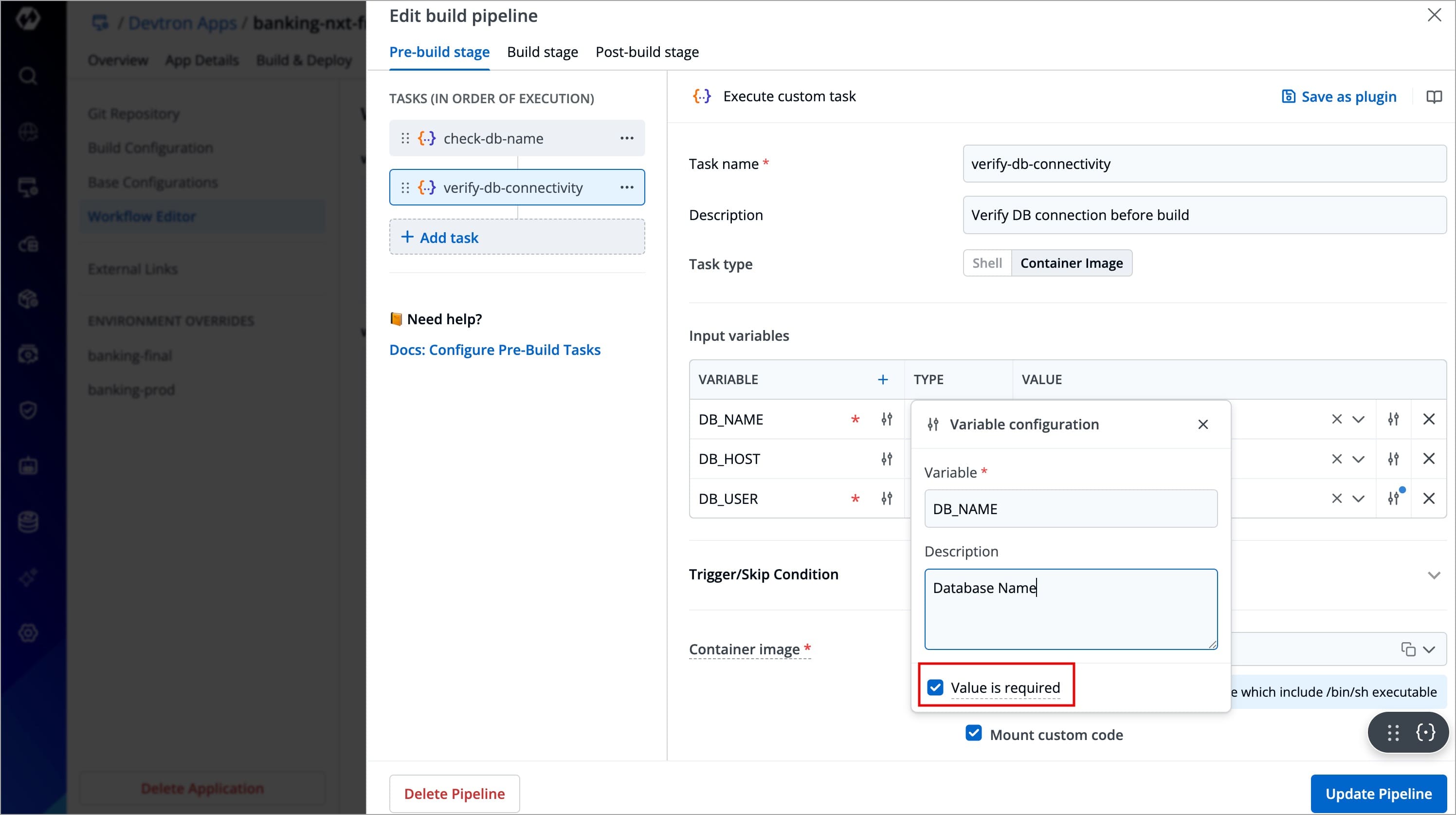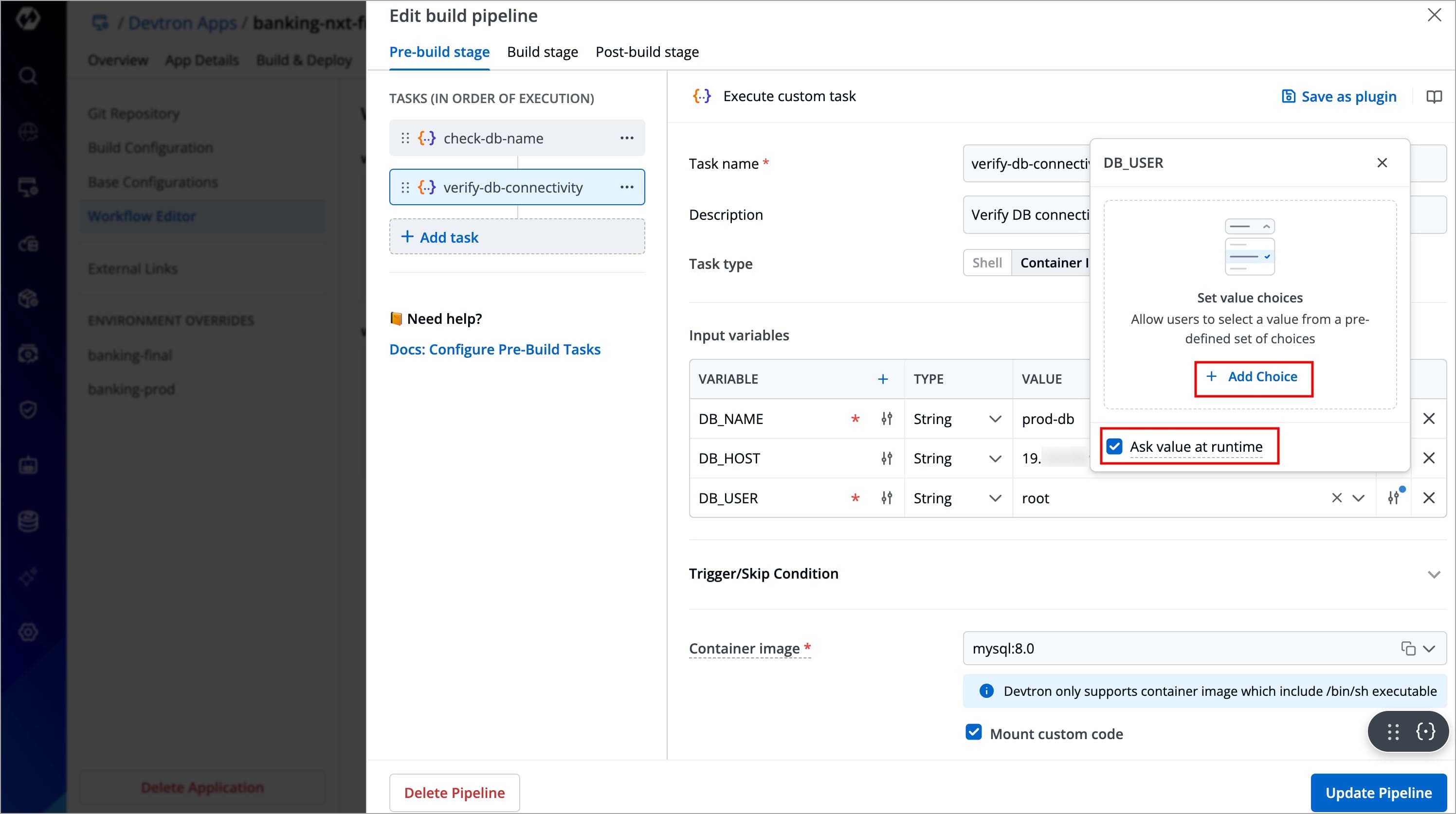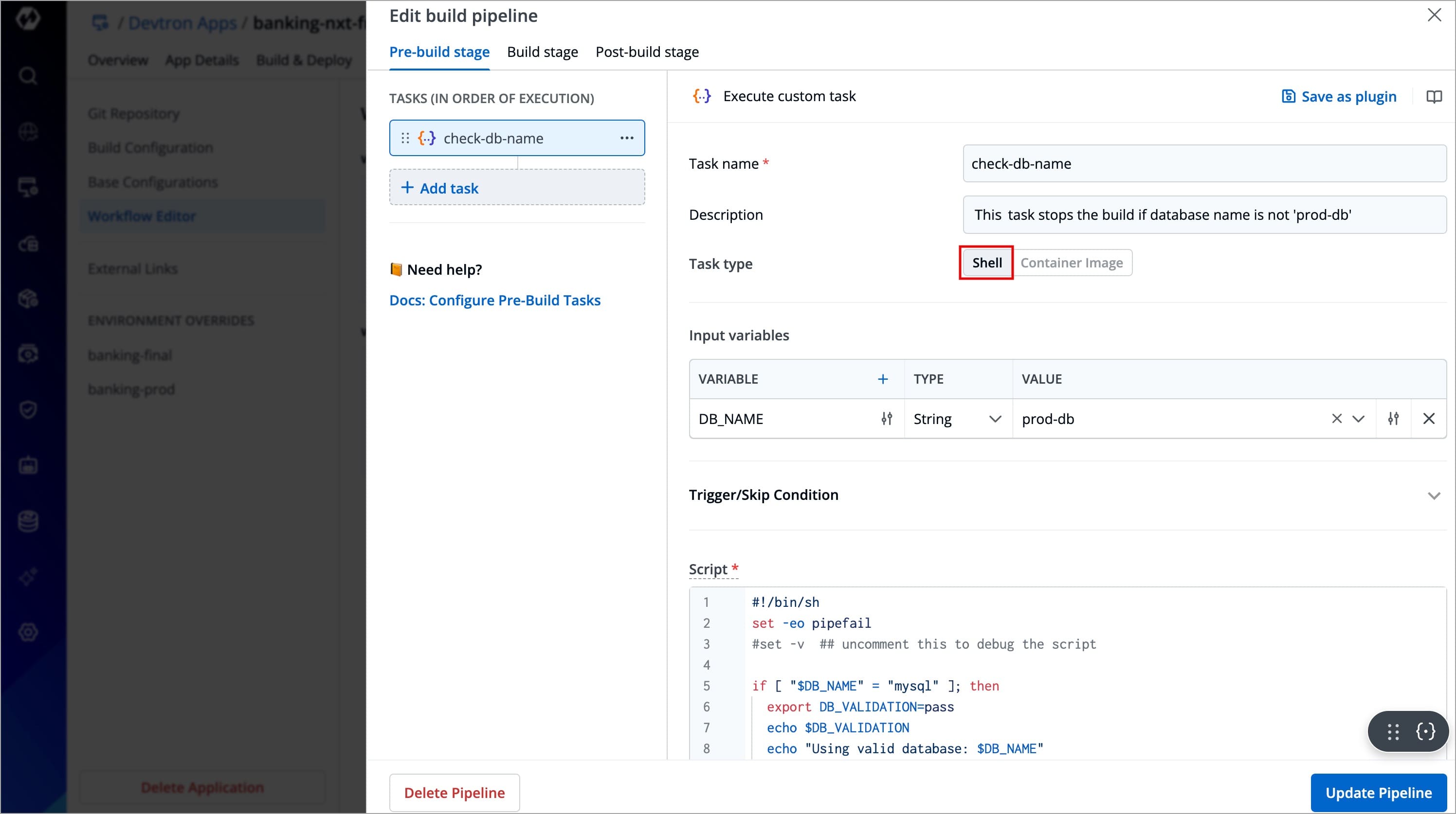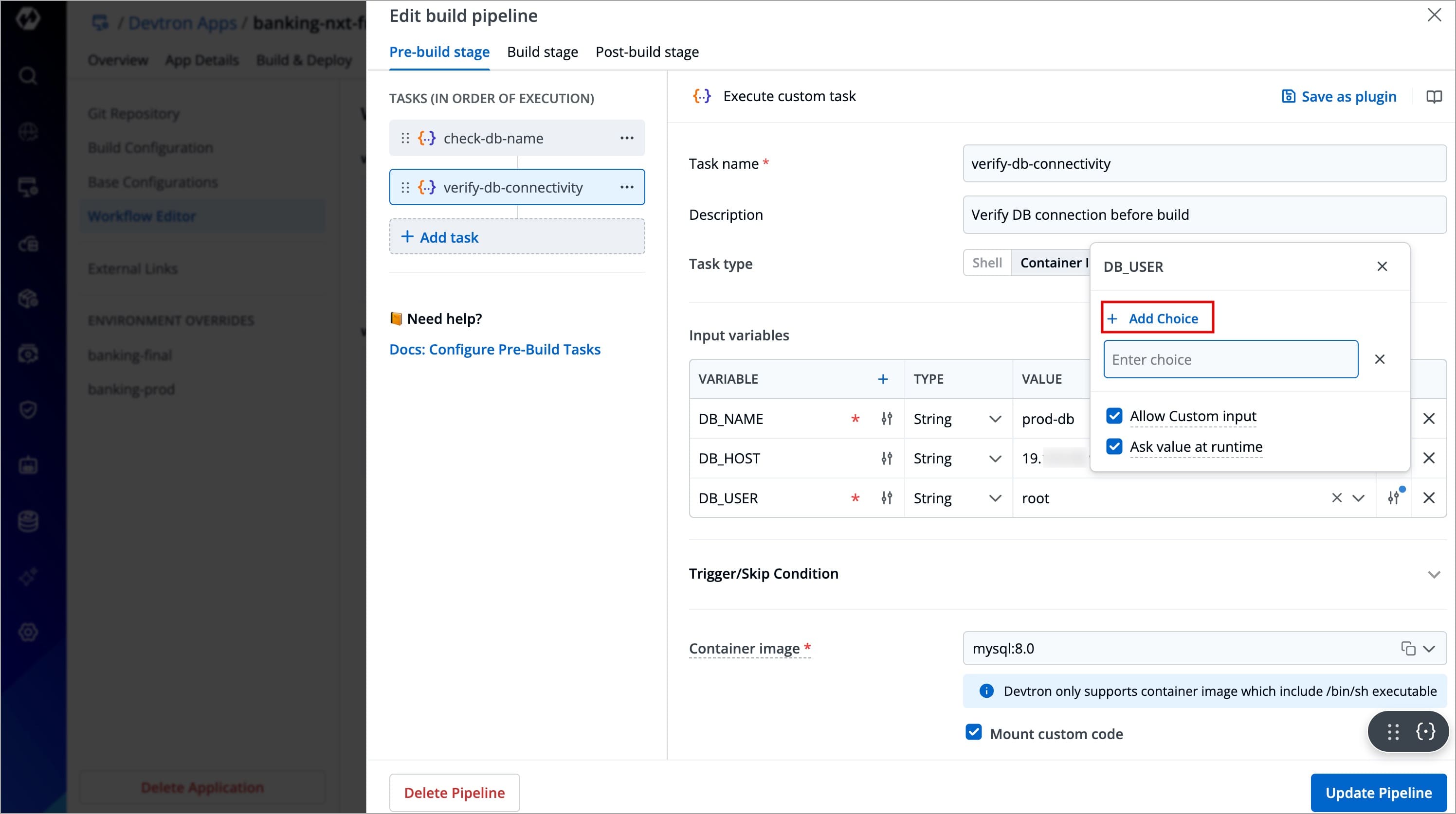 Since we have already configured a shell task to validate the database name, we will add this task after the shell task; This means it will execute after the shell task. This container image task will run only if that check passes, to verify that we are connecting to the correct database and that it is reachable before the build starts.