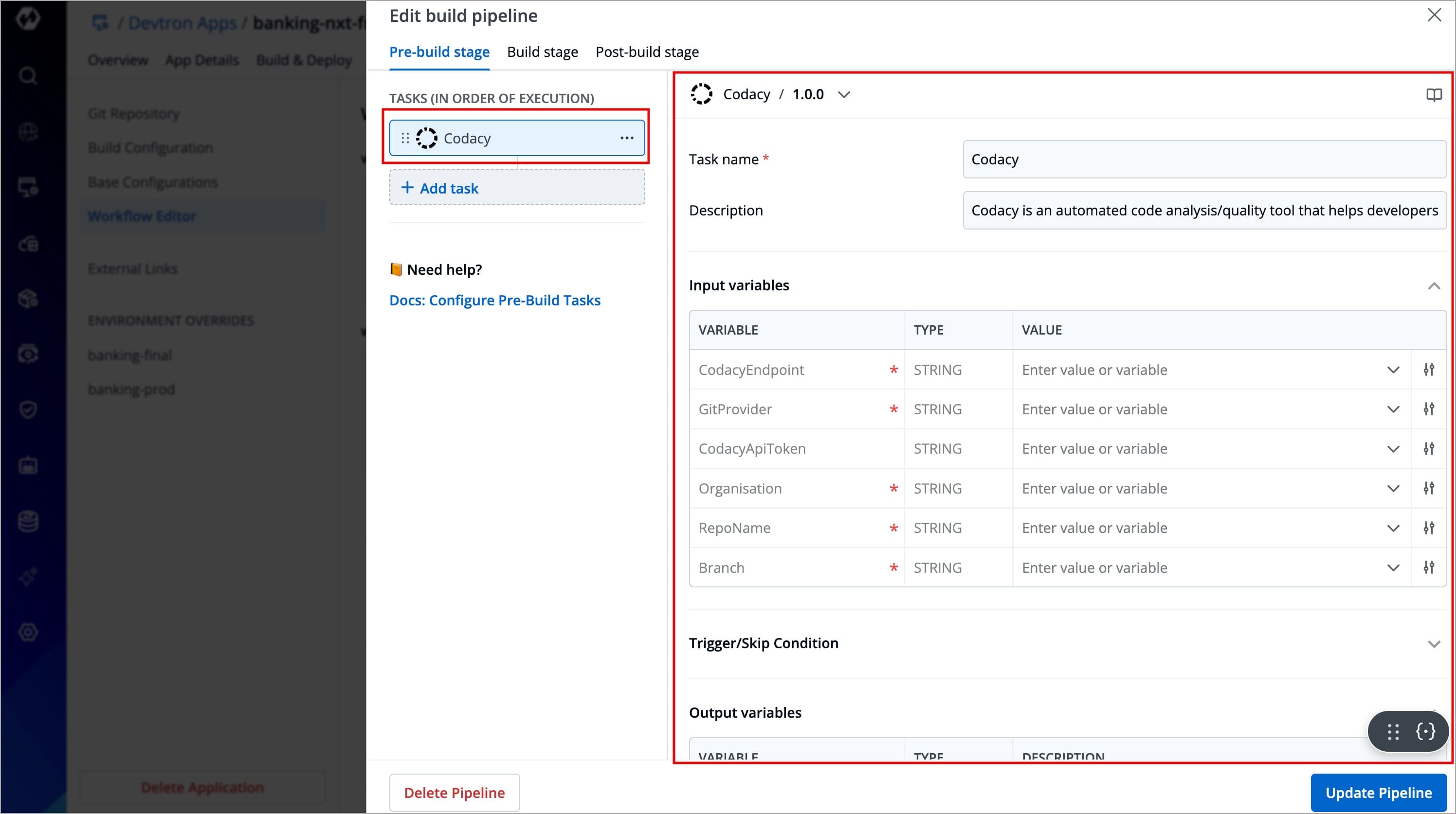 To create a task using preset plugins, let's take Codacy as an example and configure it in the Pre-Build stage in the build pipeline for finding bugs, detecting dependency vulnerabilities, and enforcing code standards.