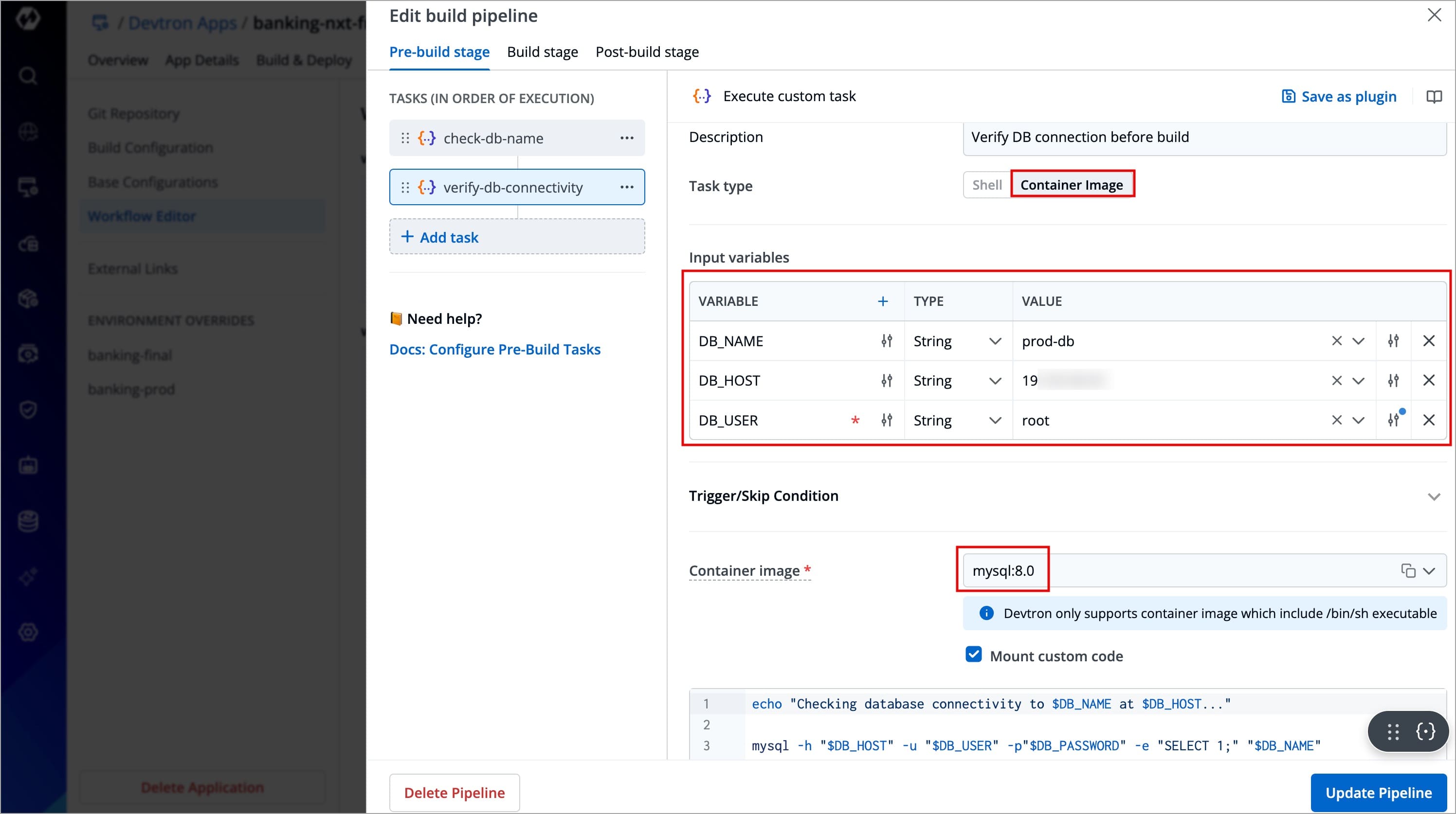 Let's take an example of a Container Image Task that verify that the configured database is reachable and accepting connections before executing build stage. This ensures that the build does not proceed if the database configuration is incorrect or unreachable, saving time and resources.