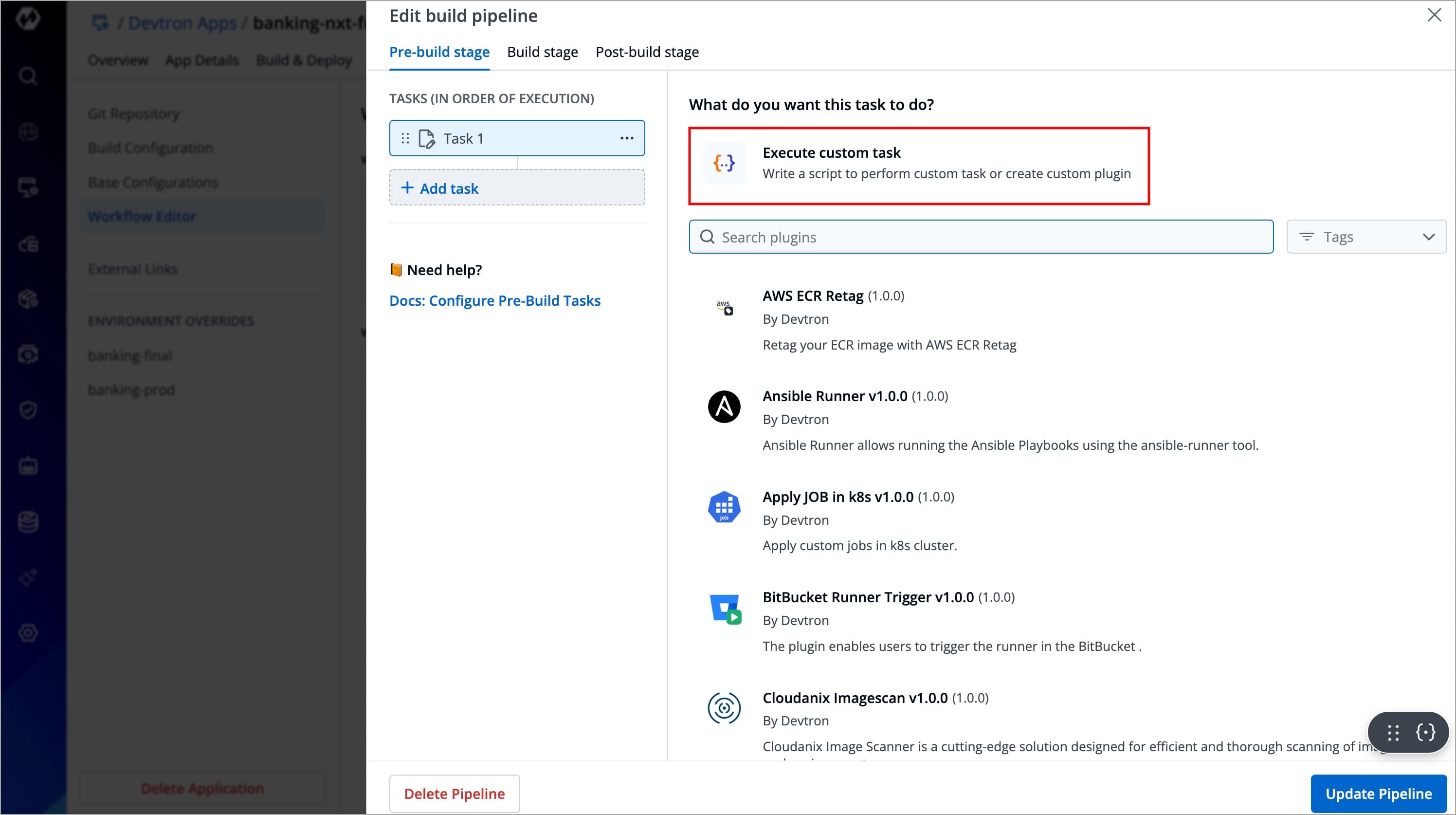 Container Image Tasks: These allow you to execute commands and scripts inside a custom Docker container. Instead of using the default environment provided by Devtron, you can specify your own container image with all dependencies and tools required for the tasks.