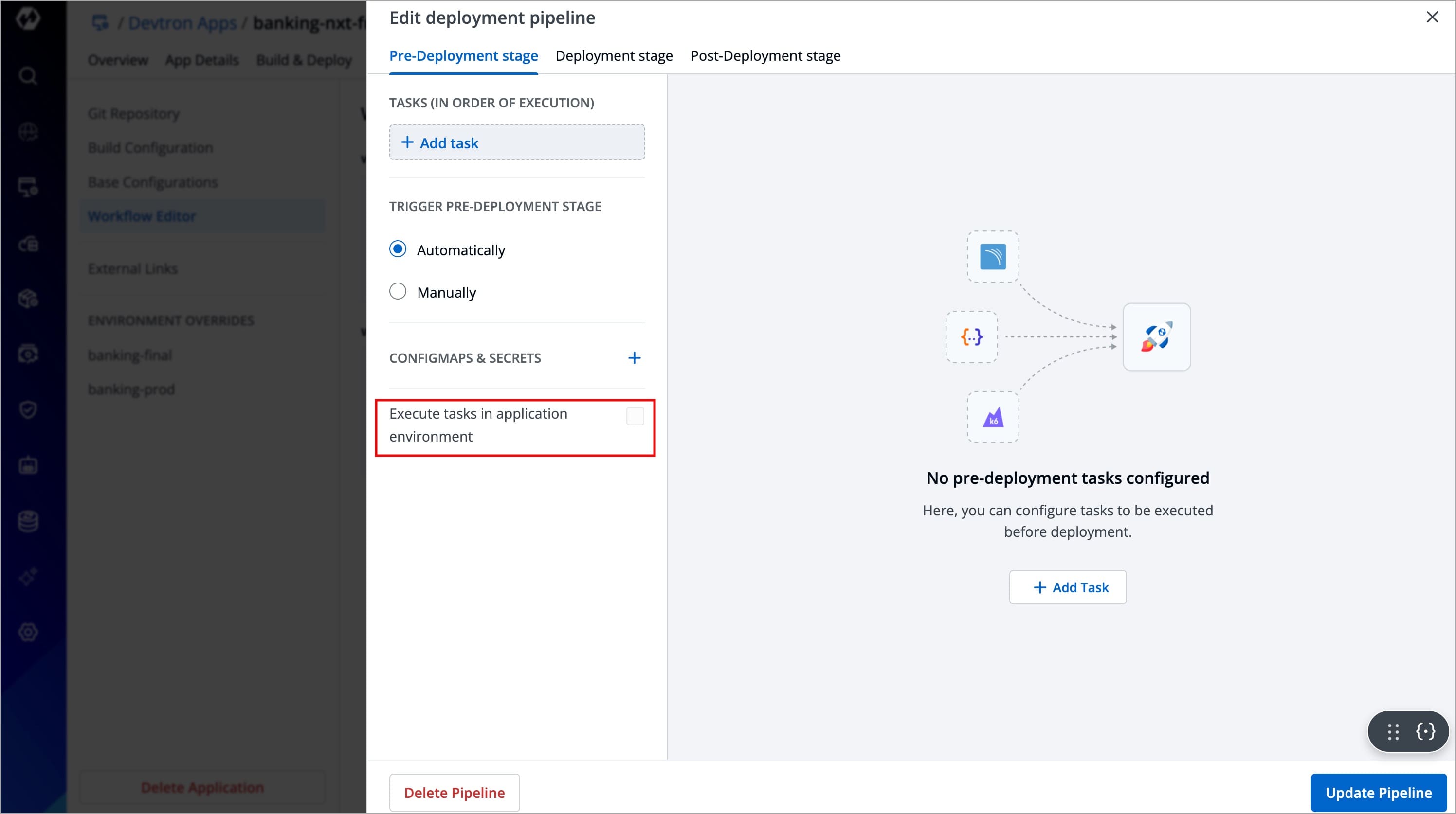 Some tasks require extra permissions for the node where Devtron is installed. However, if the node already has the necessary permissions for deploying applications, there is no need to assign them again. Instead, you can enable the Execute tasks in application environment option for the pre-CD or post-CD steps. By default, this option is disabled.