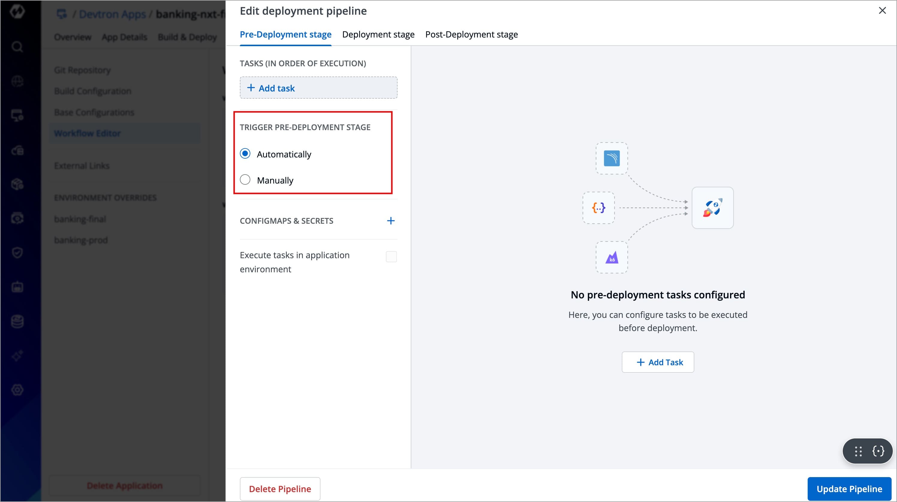 Manually: The User needs to trigger the Pre/Post-Deployment stages manually.
