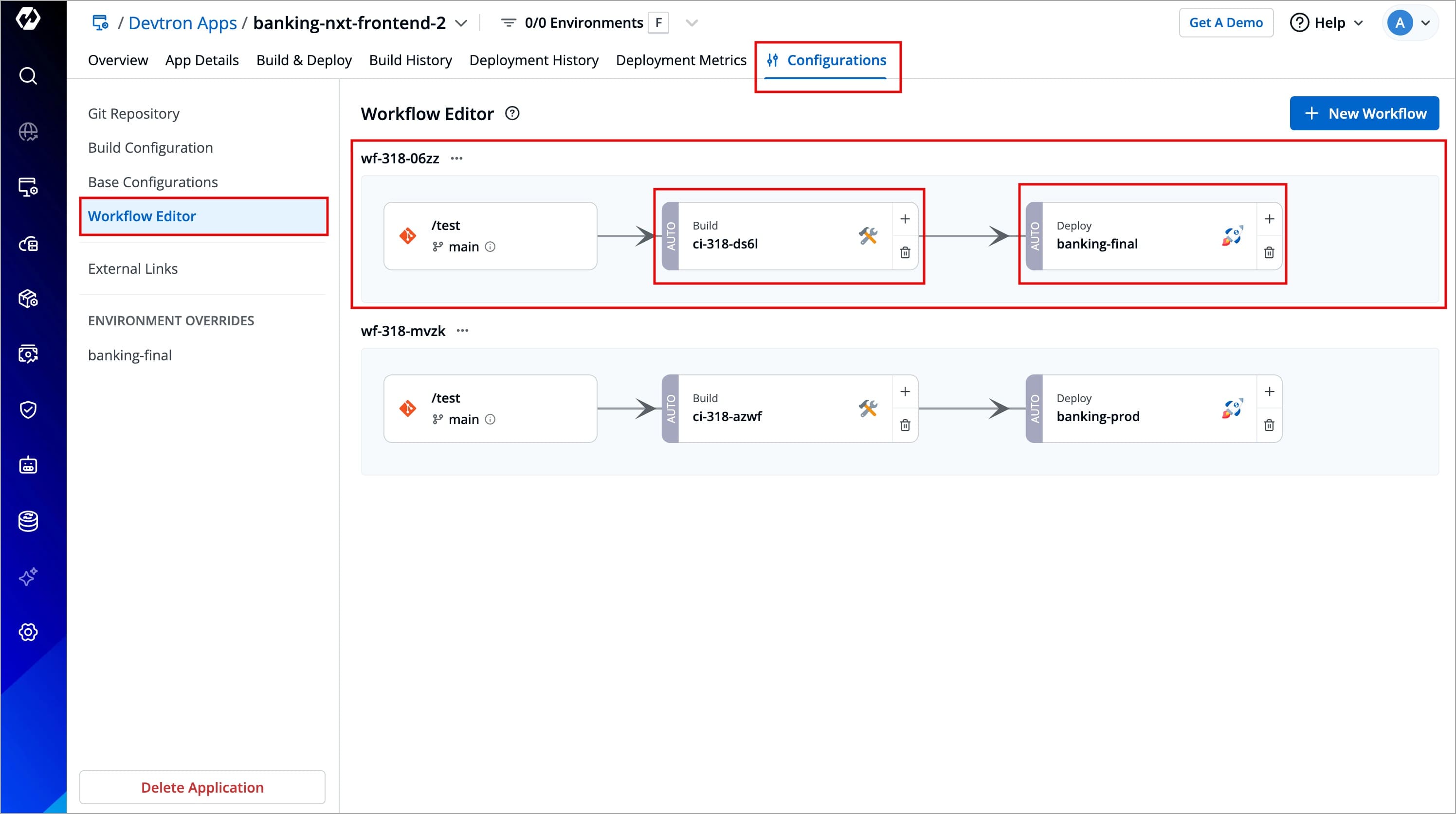 Navigate to Configurations (tab) → Workflow Editor of your Devtron App.