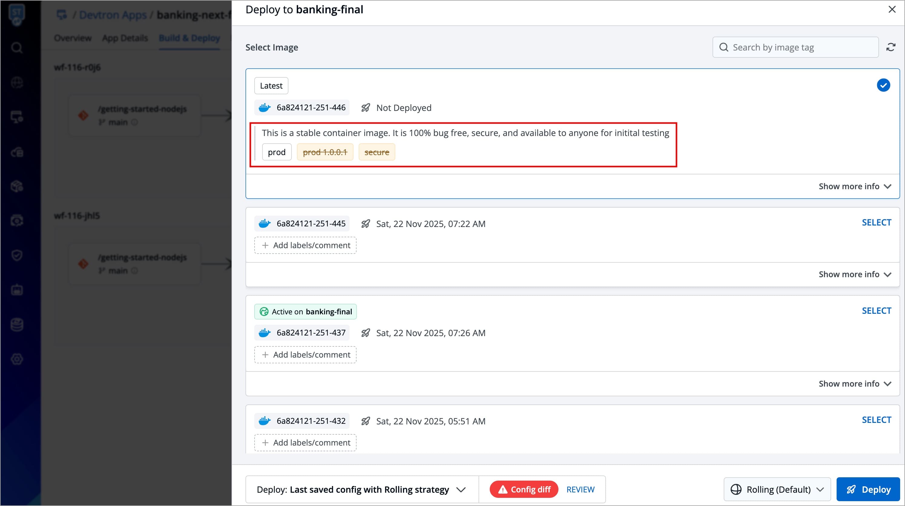 Such labels and comments will be visible only within Devtron, and will not propagate to your container registry (say Docker Hub), unlike custom image tag pattern. You may use it to simplify the management and selection of container images for deployment.