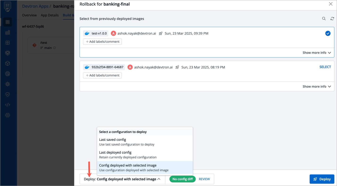 1. Once you select the previously deployed image and the configuration, review the difference between Last Deployed Configuration and the selected configuration.