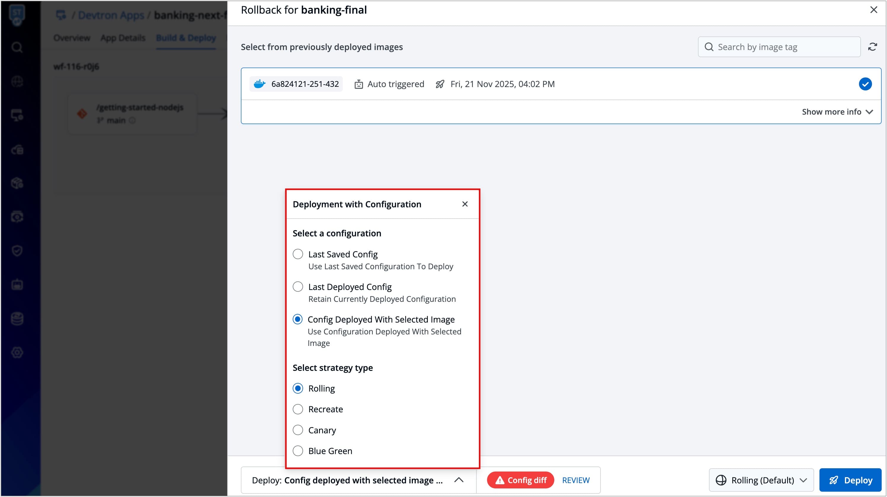 Deployments can be rolled back manually. After a deployment is completed, you can manually rollback to a previously deployed image by retaining the same configuration or changing the configuration.