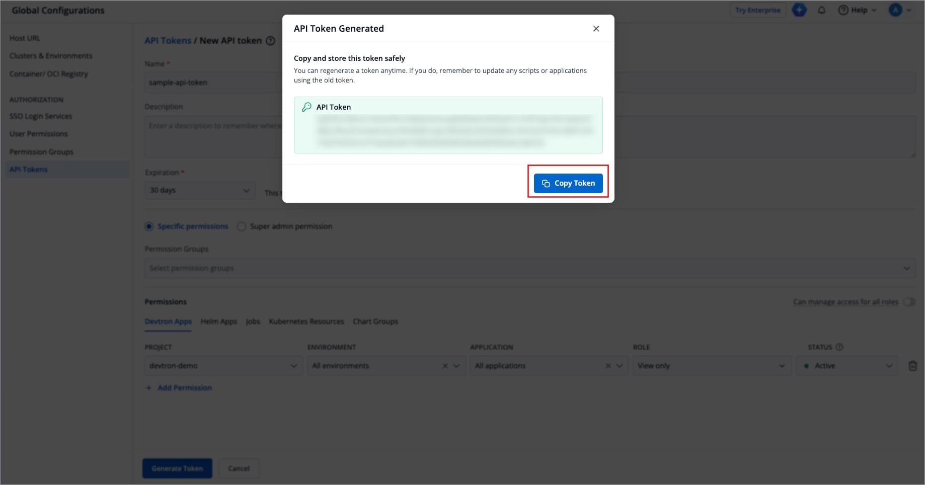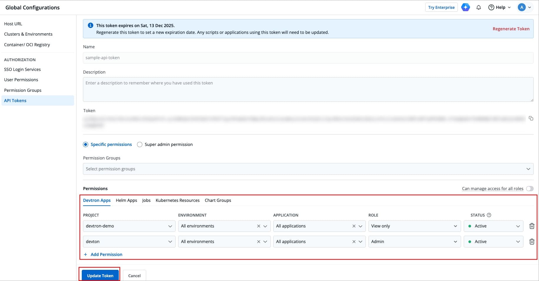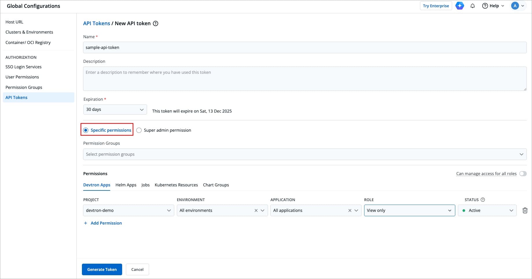Specific permissionsoption allows you to generate a token with a specific role for:Devtron Apps