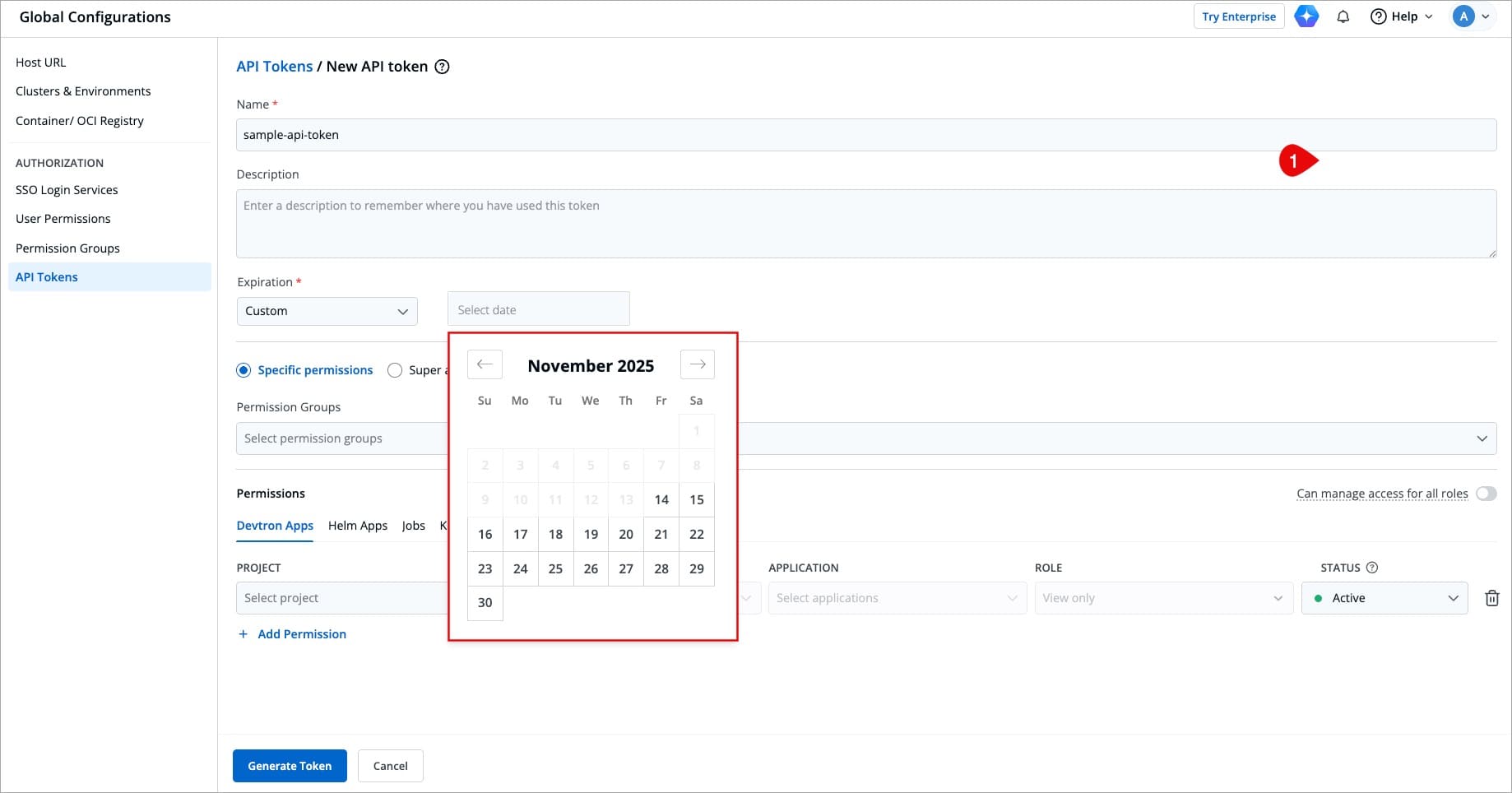 Customfrom the drop-down list. In the adjacent field, you can select your custom expiration date for the API token.