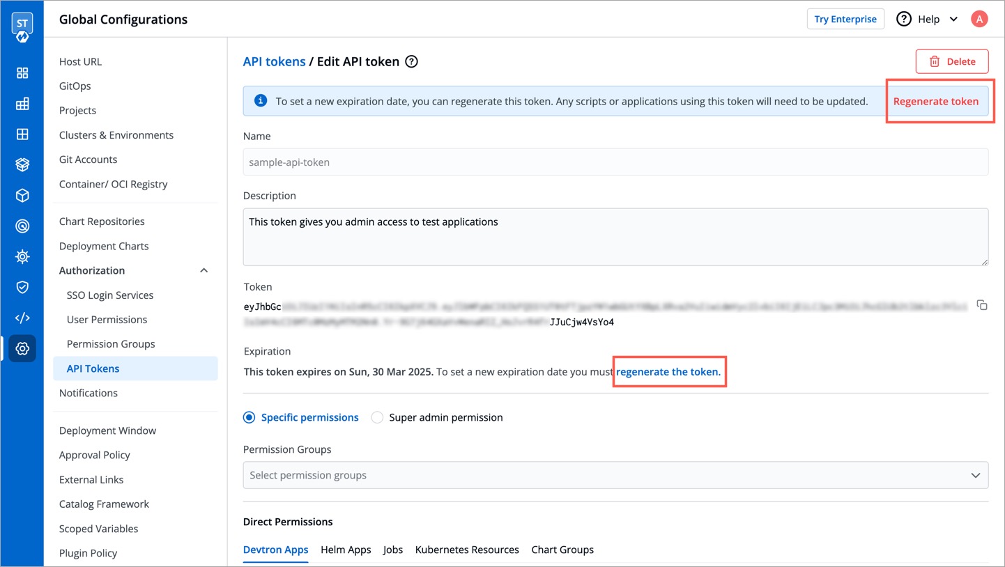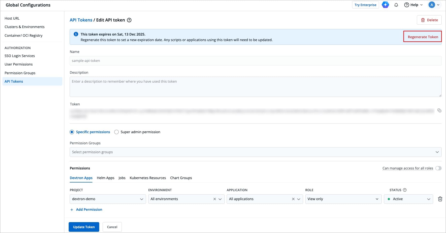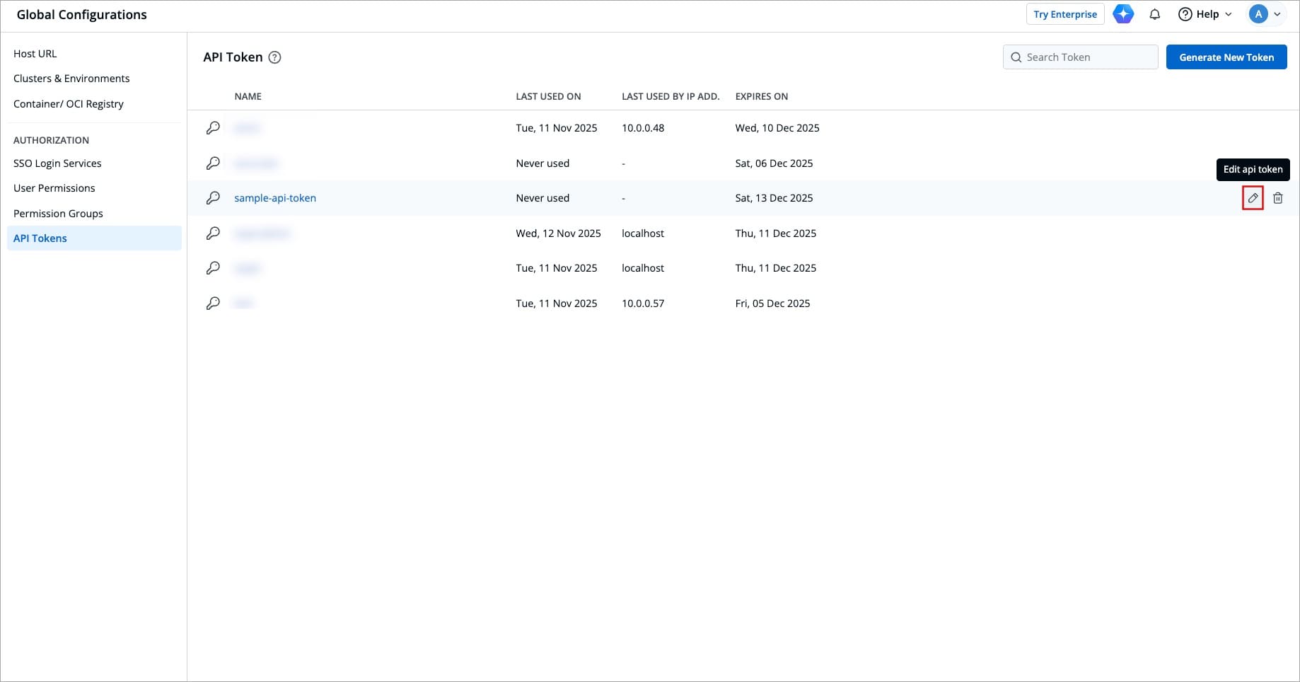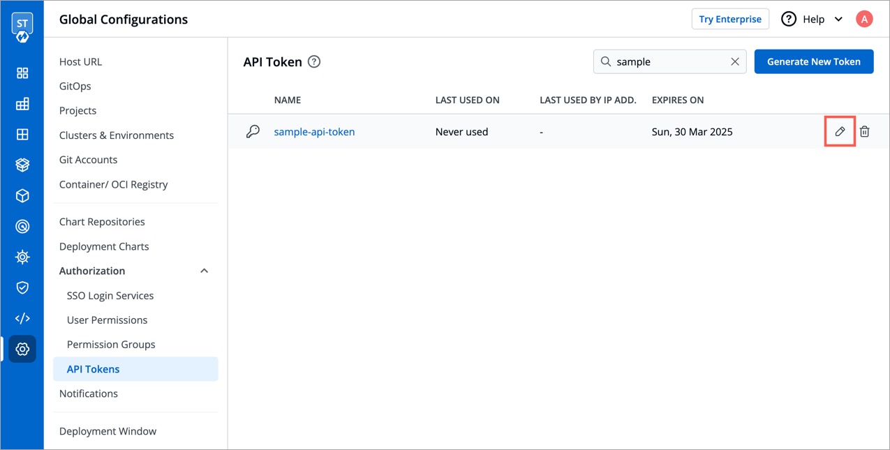 To set a new expiration date or to make changes in permissions assigned to the token, we need to update the API token in Devtron. To update the API token, click the token name or click on the edit icon.
