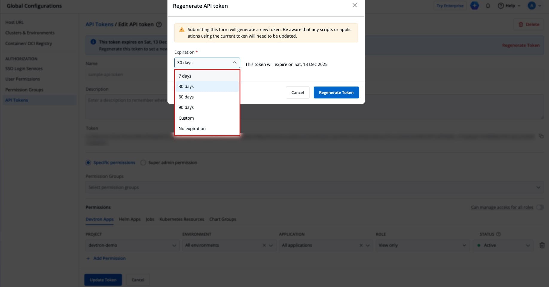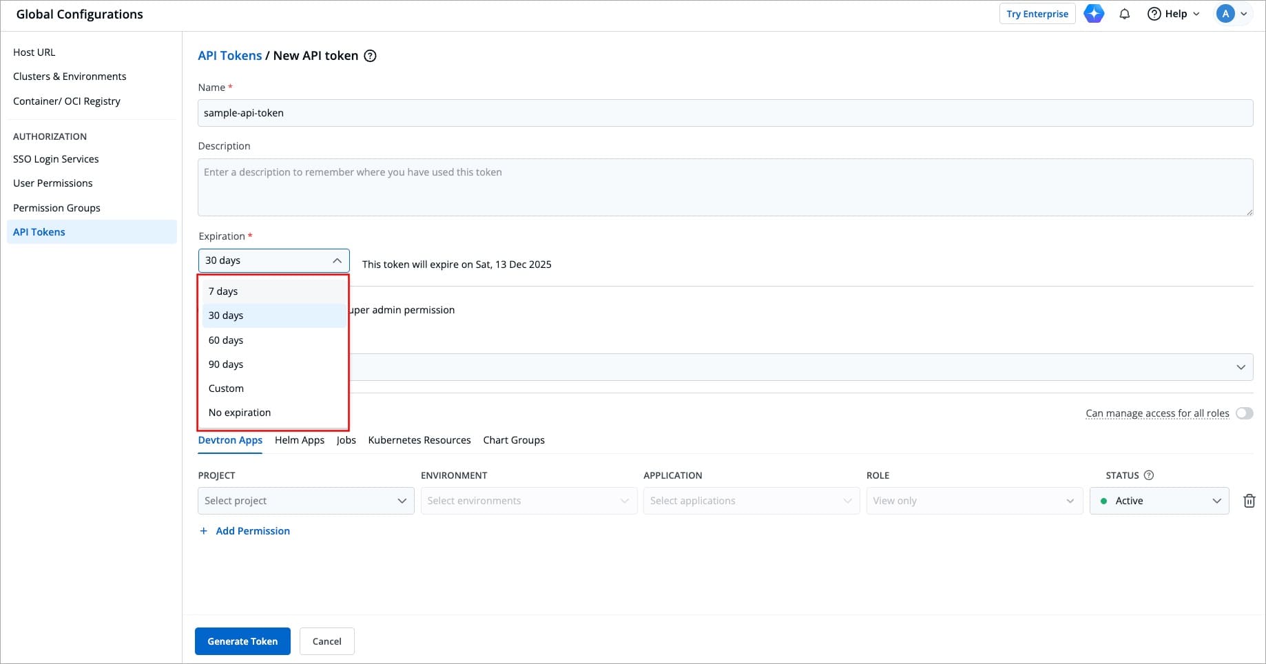 - Select an expiration date for the token (7 days, 30 days, 60 days, 90 days, custom and no expiration).