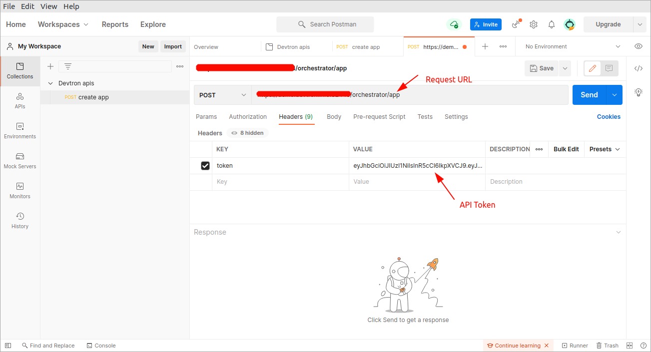 Open Postman. Enter the request URL with POST method and under HEADERS, enter the API token as shown in the image below.