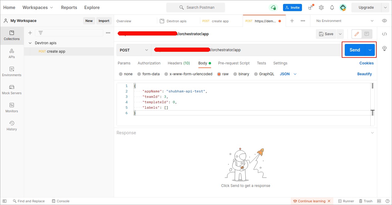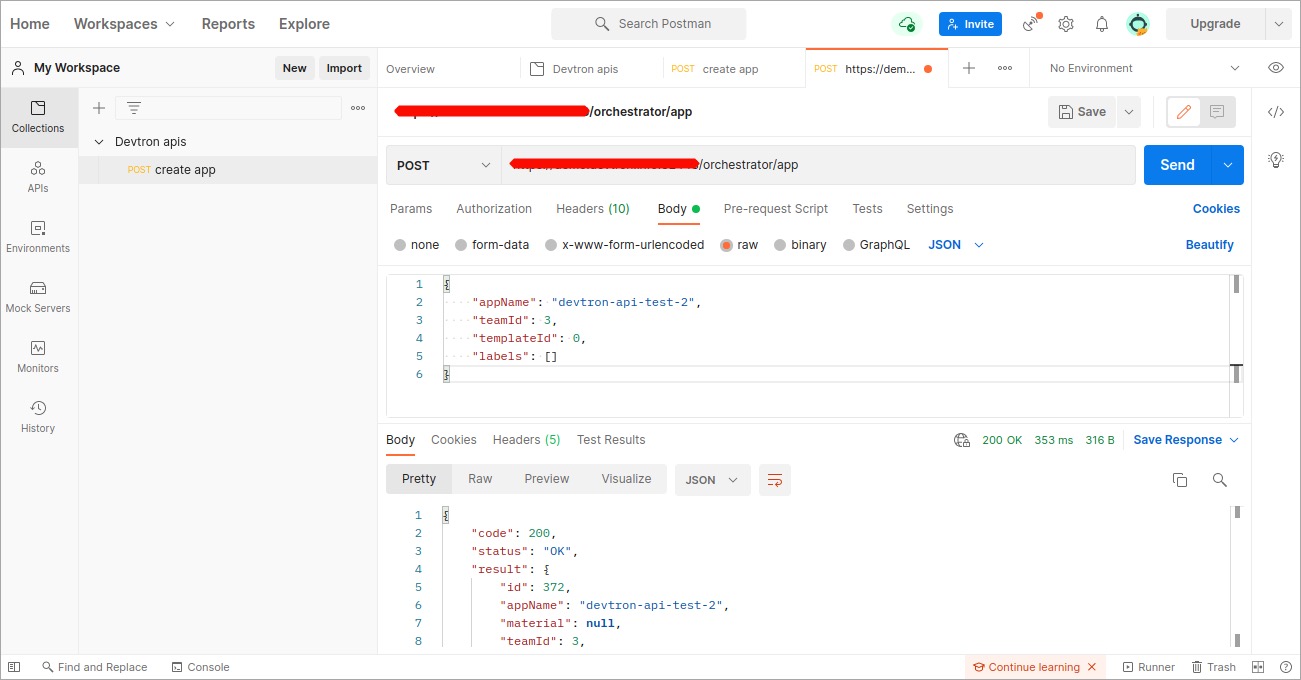 As soon as you click Send, the created application API will be triggered and a new Devtron app will be created as provided in the payload.