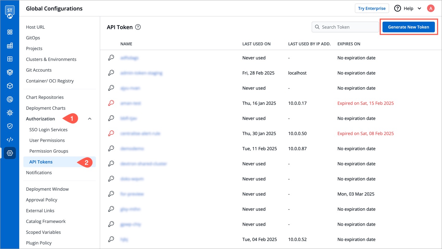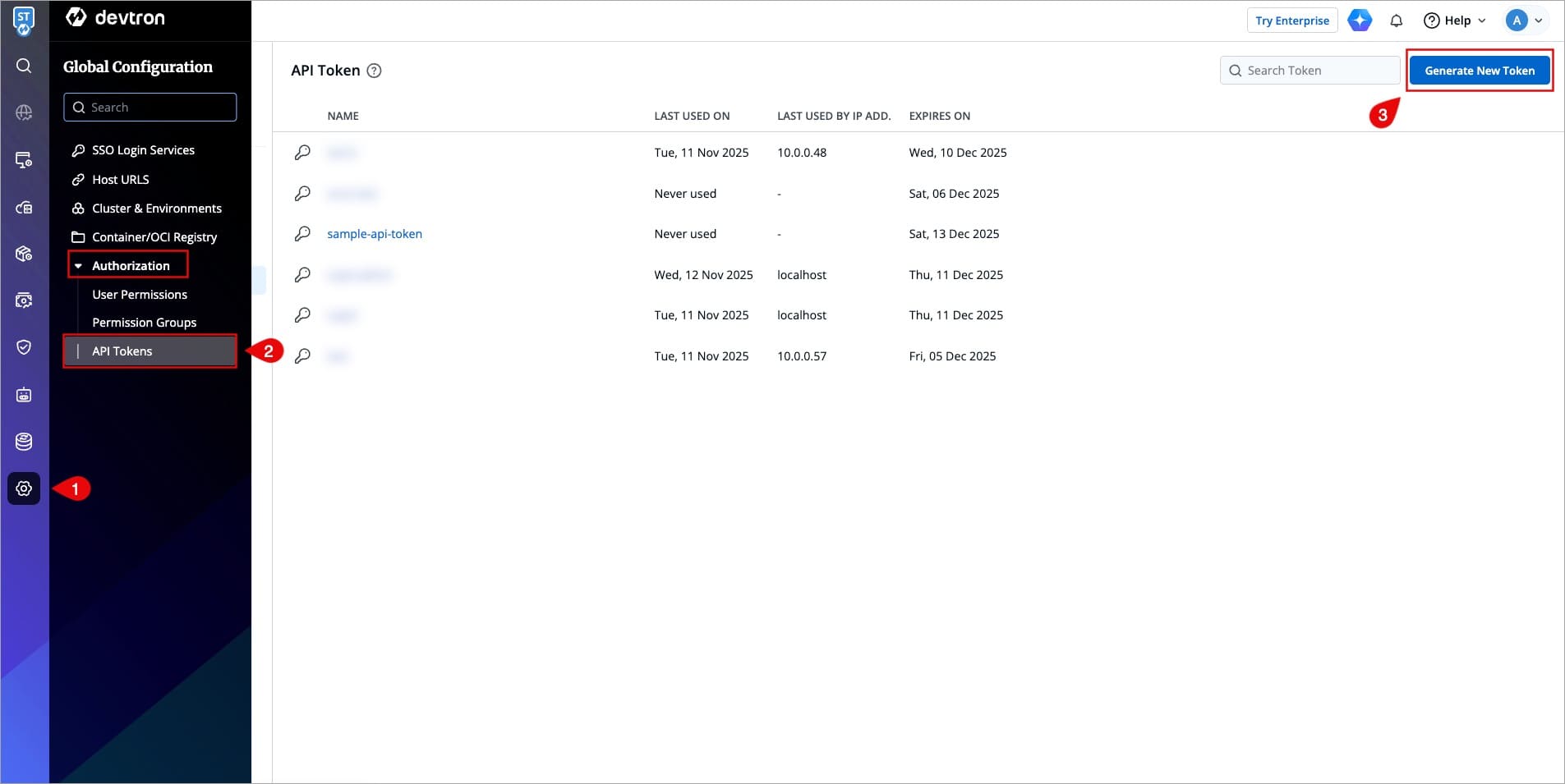 To generate API tokens, go to Global Configurations -> Authorization -> API tokens and click Generate New Token.