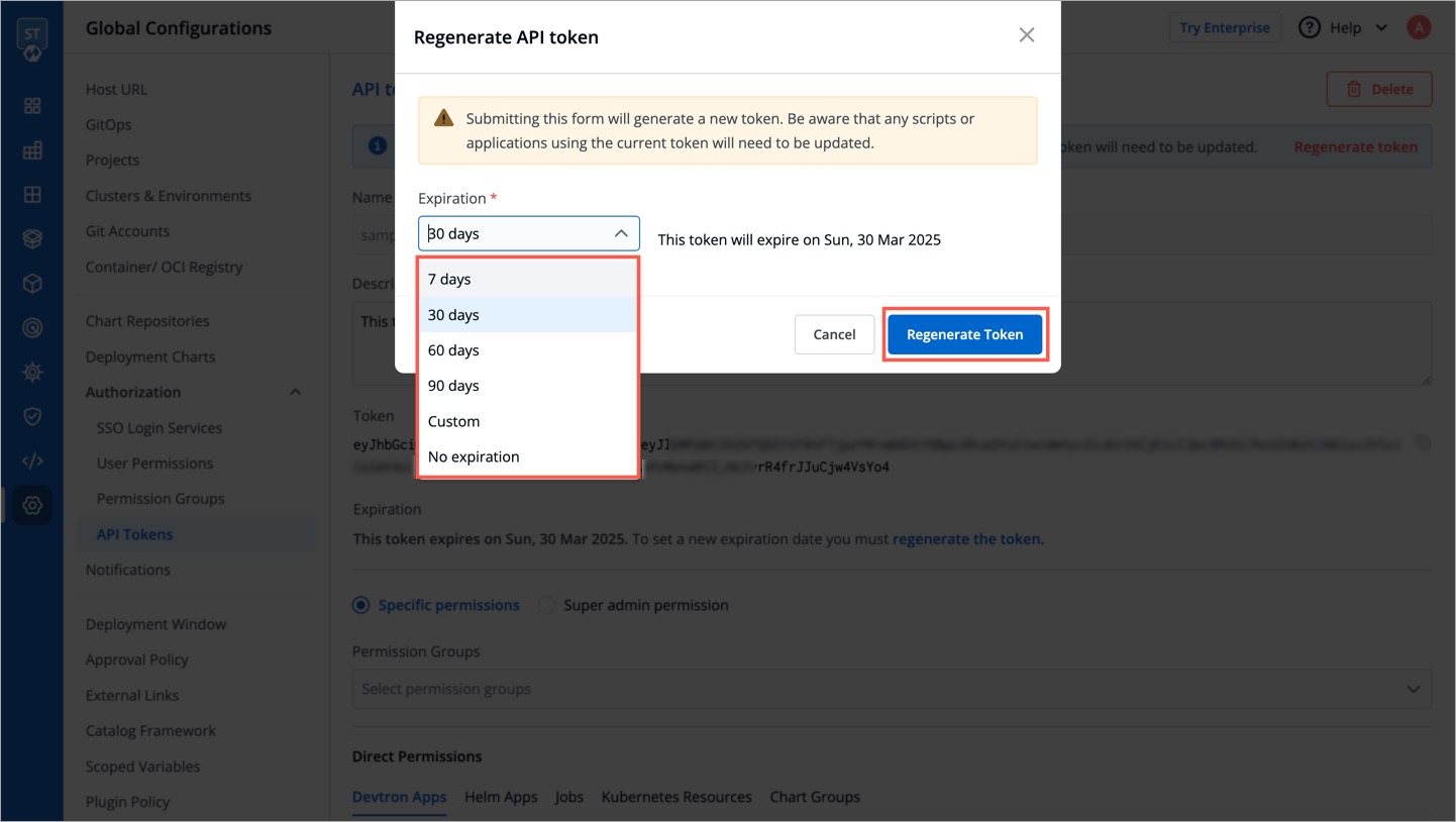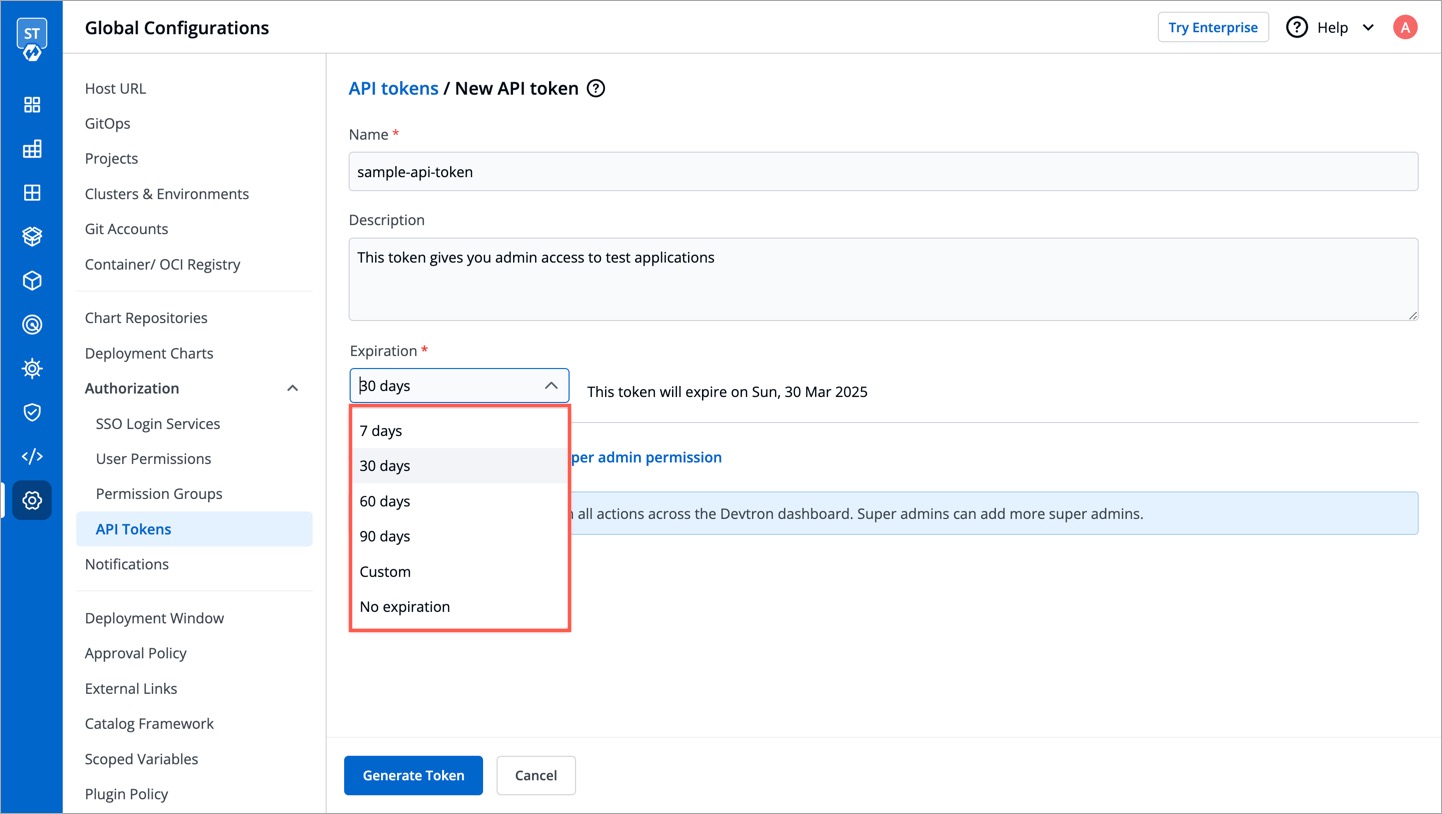 • Select an expiration date for the token (7 days, 30 days, 60 days, 90 days, custom and no expiration).