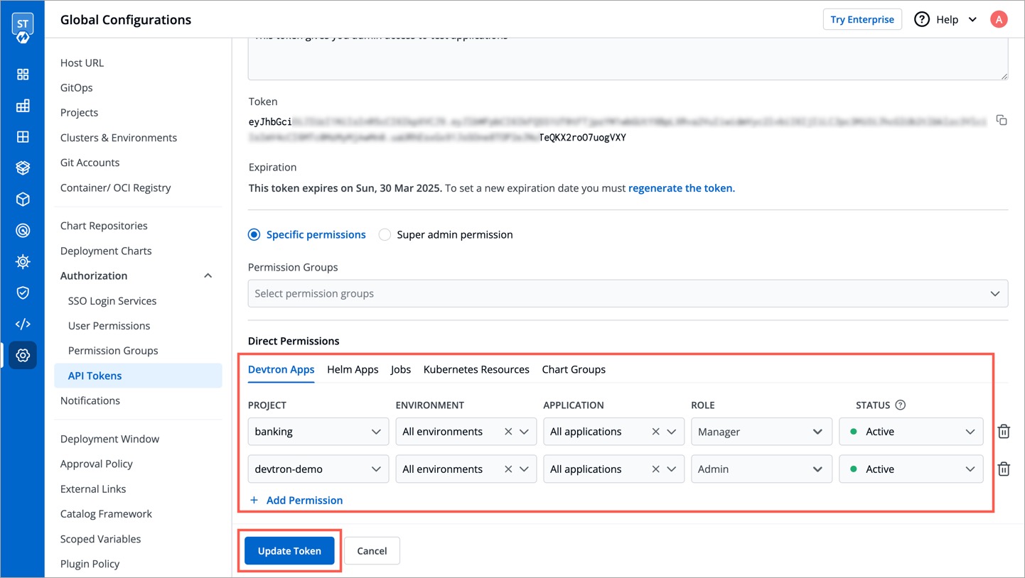 To update API token permissions, give the permissions as you want to and click Update Token.