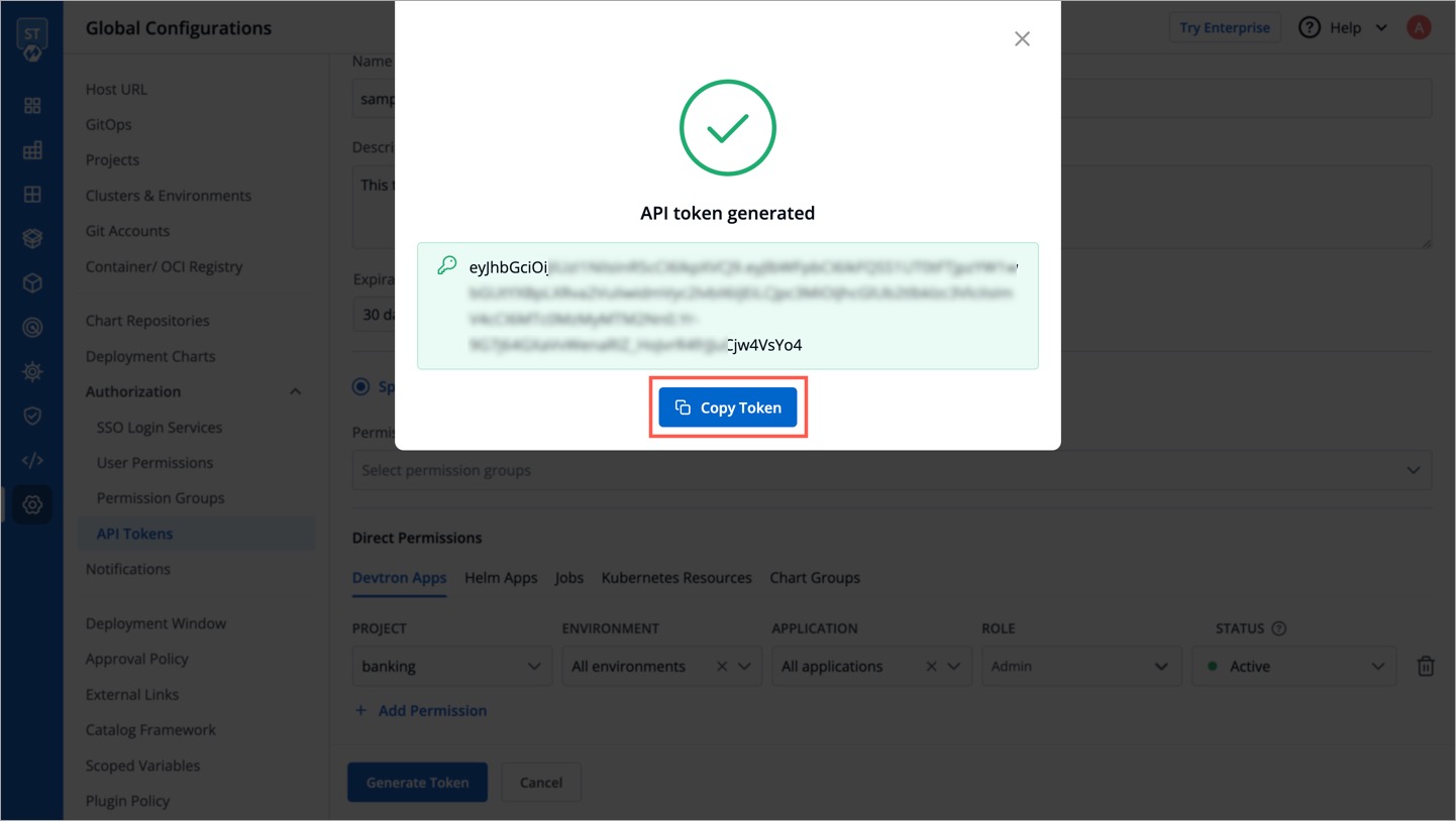 To delete an API token, click delete icon. Any applications or scripts using this token will no longer be able to access the Devtron API.
