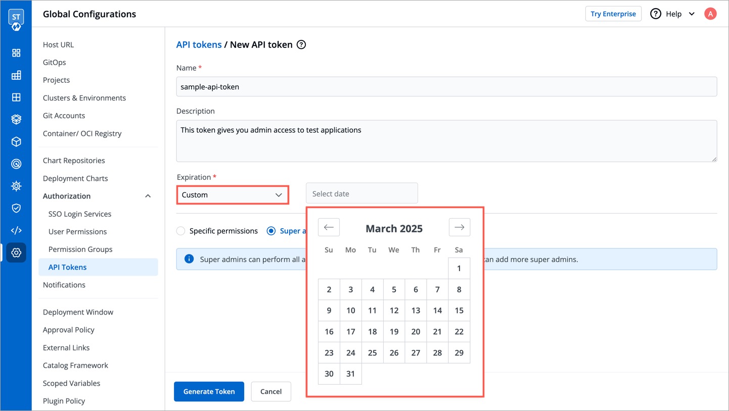 • To select a custom expiration date, select Custom from the drop-down list. In the adjacent field, you can select your custom expiration date for the API token.